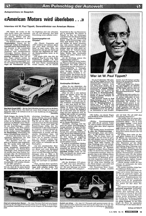 ... Tippett zur Ford Motor Company, wo er in der Lincoln-Mercury-Abteilung in erster Linie für Marketingprobleme zuständig war. 1972 wurde er zum «Vice-President of product and marketing» der Philco-Ford Corp. in Philadelphia ernannt. Ein Jahr spä- ter übersiedelte er nach Grossbri- «Wir hoffen, von diesem Wagen rund 40 000 bis 50 000 Einheiten verkaufen zu können.» «Die Finanzierung dieses Investitionsprogramms benötigt zweifellos Chef mit indianischem Namen — Der Jeep Cherokee Chief stellt eine Spezialausführung dar. Die elegante Bemalung umfasst auch die Felgen. Er ist ein besonders beliebtes Freizeitfahrzeug und wird viel als Vorspann für Wohnwagen eingesetzt. Zurück zum Urtyp — Der Jeep CJ-7 Renegade stellt gewissermassen die moderne, technisch stark weiterentwickelte Fassung des Urtyps aller «4x4» dar Der ÜberrollbügeLdient der Sicherheit, wird aber auch zur Befestigung des Blachenverdecks verwendet. (Werkbilder) «Mr. Tippett, Sie wurden im Oktober letzten Jahres zum Generaldirektor der American Motors Corporation ernannt. Welches sind Ihre derzeitigen Hauptprobleme in Ihrer neuen Tätigkeit?» «Im Moment stellen sich mir drei Hauptaufgaben: Erstens der beschleunigte Ausbau der Produktionskapazität unserer Jeep-Division, denn wir erwarten in den kommenden Jahren eine starke Zunahme der Nachfrage nach allradgetriebenen Fahrzeugen. Zweitens ...