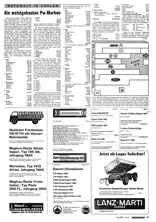 ... 3. Volkswagen Deutschland Brasilien Mexiko Südafrika 4. Toyota Japan 5. Fiat Italien Argentinien Indien 6. Renault Frankreich Argentinien 1 808 227 537 722 436 000 405 273 234 000 98 742 88 100 30 750 3 638 814 2 299 789 102 000 15 186 2 429 675 1 218 500 313 800 53 700 19 900 1 487 000 1 370 000 60 000 12 800 1 442 800 1 048 000 28 450 1 076 450 Zu dieser Rangliste drängen sich jedoch einige präzisierende Bemerkungen auf: So wurden noch im Vorjahr die in Kanada hergestellten Pontiac auch unter der Marke Chevrolet registriert. Von der Nissan Motor Co. wurden 1 353 000 Einheiten produziert, doch teilen sich diese in die Marken Datsun und Nissan auf. Betreffend die Marke Renault kann man sich streiten, ob auch die spanischen Fasa-Renault mitgezählt werden sollten. Auf den weiteren Rängen bis zum ersten Dutzend figurieren ferner 8. Opel 887 963 9. Oldsmoblle 807 194 10. Plymouth 767 416 11. Citroen 722 515 12. Dodge 704 846 Daraus ergibt sich also, dass unter den zwölf führenden Marken nicht weniger als fünf amerikanische, eine amerikanisch dominierte multinationale (Ford), je zwei deutsche und französische sowie je eine japanische und italienische Marke rangieren. Nehmen wir nun an, dass die Produktion der Nissan Motor Co. sich je zur Hälfte auf die Marken Datsun und Nissan aufteilt (genaue Verteilung nicht bekannt), so ergibt sich folgende weitere Rangfolge: ...