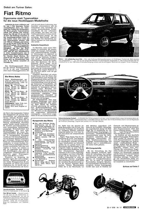 ... Fahrzeugtyp einer neuen Fahrzeuggeneration, mit Neues Mittelklassemodell zwischen den Typen Fiat 128 und 131, Ausstattungsvarianten Lusso (L) und Confort Lusso (CL) Ritmo 60: 1,1-Liter-Motor; 60 DIN-PS (44 kW) bei 5800/min, 8,3 mkp (81 Nm) bei 3500/min, Spitze 145 km/h Ritmo 65: 1,3-Liter-Motor; 65 DIN-PS (48 kW) bei 5800/min, 10 mkp (98 Nm) bei 3500/min, Spitze 150 km/h Ritmo 75: 1,5-Liter-Motor; 75 DIN-PS (55 kW) bei 5800/min, 12 mkp (118 Nm) bei 3000/min, Spitze 160 km/h Lieferbeginn: Italien Ende Juni, Schweiz: geplant November Preise: Noch keine Angaben erhältlich der Fiat in den kommenden 5 Jahren den Erzeugnissen der grossen Konkurrenzfirmen auf entsprechendem Niveau stehende Pendants gegen- überstellen will. Um dieses Ziel zu erreichen, wurden bereits bei dessen Planung entscheidende Prioritäten gesetzt, welche sowohl Funktionalität, Komfort und Fahrsicherheit als auch ansprechende Fahrleistungen, ausgeprägte Wirtschaftlichkeit und Zuverlässigkeit, aber auch hohe Wertbeständigkeit des neuen Produktes beinhalten. Rund die Hälfte der 70 bereitgestellten Prototypen wurden im Fiat-Versuchsgelände sowie auf Strassen härtesten Erprobungen unterzogen. Weitere Exemplare hatten auf unterschiedlichsten Strassenstücken, in extrem feuchten Gegenden sowie in salzhaltigen Wasserstrassen unerbittliche Tests über sich ergehen zu lassen, bei welchen es galt, die ...