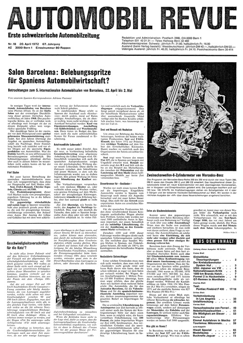 ... ausser jedem Zweifel, dass der neue, in Vorbereitung befindliche Gesamtarbcitsvertrag eine allgemeine Anhebung der Löhne bringen wird. Offensichtlich versprechen sich auch die spanischen Autoproduzenten einiges von der psychologischen Wirkung dieser neuen Lohnrunde: Diese dürfte im Zeitraum zwischen dem Inkrafttreten und jenem Moment, in dem sich die Inflationsspirale wieder neu zu drehen beginnt, ihre grösste Wirkung im Sinne einer Stimulierung der Kauflust entfalten. Die Verkaufsstrategen versprechen sich vom nächsten Oktober an, oder vielleicht schon einige Wochen vorher,, eine gewisse Erholung auf dem Marktsektor der preisgünstigen Kleinwagen. Jedermann wünscht diese Erholung herbei, aber fast niemand glaubt so recht daran. Zur Zeit übersteigt, wie bereits bemerkt, das Angebot die Nachfrage beträchtlich. Dies zeigt sehr deutlich die Tatsache, dass jedes in Spanien hergestellte Auto ohne oder mit sehr kurzer Lieferfrist erhältlich ist. In vielen Fäl- Geschwindigkeitsvorschriften für die Katz'? In nicht allzu ferner Zukunft wird auf den Schweizer V' eberlandstrassen der Versuch mit der allgemeinen Geschwindigkeitsbeschränkung auf 100 km/h gestartet werden. Wir wollen an dieser Stelle nicht noch einmal auf die nach wie vor umstrittenen Erfolgsaussichten dieser Massnahme zu sprechen kommen, sondern vielmehr auf ein konkretes Problem hinweisen, ...