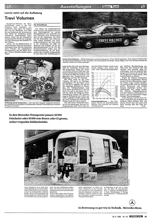 ... den Kompressormotor wählte man die Vergaserausführung, da der Kompressor dem Vergaser nachgeschaltet ist und durch den Verdichtungsvor- Lancia Trevi Volumex — Mittels Kompressor wird die Leistung von 115 auf 135 PS angehoben. Dank höherem Drehmoment im unteren Drehzahlbereich ist hier besonders viel Durchzugskraft vorhanden. Dieser Wagen wird in der Schweiz anfangs des nächsten Jahres zum Verkauf gelangen. gang bereits eine sehr gute Homogenität des Gemisches erreicht wird. Mit Kompressor leistet der Motor 135 PS (99,5 kW) bei 5500/min. Das höchste Drehmoment beträgt 21 mkp und wird bei 3000/min erreicht, was gegenüber dem Vergasermotor eine Steigerung von über 22% darstellt. Das Werk nennt für den Trevi Volumex 190 km/h als Höchstgeschwindigkeit. Für den Spurt von 0 bis 100 km/h vergehen 9,6 und für den stehenden Kilometer 31 Sekunden. Die Verbrauchszahlen nach ECE-Norm: bei 90 km/h 7,7, bei 120 km/h 9,6 und in der Stadt'13,5 L/ 100 km. Dank der fülligeren Drehmomentkurve konnte die Untersetzung im Differential von 3,786:1 auf 3,421:1 geändert werden. Somit legt der Trevi Volumex bei 1000/min im fünften Gang 36,7 km/h zurück. Auf einer ersten Probefahrt konnten wir uns überzeugen, dass der Leistungszuwachs beim Trevi nicht nur auf dem Papier besteht. Auch in den oberen Gängen setzt bereits kurz nach 1000 Kurbelwellenumdrehun- Leistungssteigerung — ...