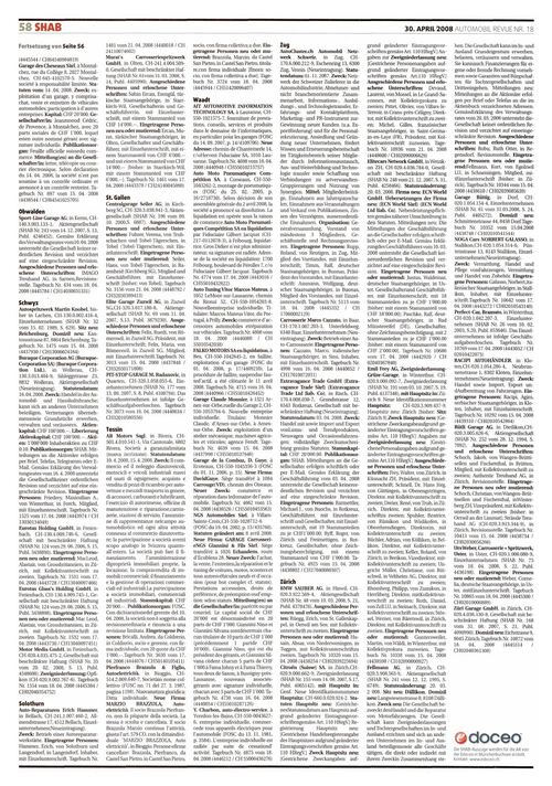 ... CH-140.3.003.133-1, Aktiengesellschaft (SHAB Nr. 243 vom 14.12.2007, S. 13,Publ. 4246452). Gemäss Erklärung des Verwaltungsrates vomlO. 04.2008untersteht die Gesellschaft keiner ordentlichen Revision und verzichtet auf eine eingeschränkte Revision. Ausgeschiedene Personen und erloschene Unterschriften: IMAGOTreuhand AG, in Sarnen, Revisionsstelle. Tagebuch Nr. 434 vom 18. 042008 (4445784 / CH14030031331) SchwyzAutospritzwerk Martin Knobel, bisher in Lachen, CH-130.0.002.416-4,Einzeluntemehmen (SHAB Nr. 32 vom 15. 02. 1989, S. 629). Sitz neu:Reichenburg. Domizil neu: Kantonsstrasse 87,8864 Reichenburg. Tagebuch Nr. 1475 vom 15. 04. 2008 (4437930 / CH13000024164)Buraque Corporation AG (Buraque- Corporation SA) (Buraque Corporation Ltd.), in Wollerau, CH- 130.3.013.404-9, Sihleggstrasse 23,8832 Wollerau, Aktiengesellschaft (Neueintragung). Statutendatum:16.04.2008. Zweck: Handel in der Automobilund Haushaltsbranche;kann sich an anderen Unternehmen beteiligen, Vertretungen übernehmensowie Grundstücke erwerben, verwalten und veräussem. Aktienkapital: CHF lOO'OOO.--. LiberierungAktienkapital: CHF lOO'OOO.--. Aktien: l'OOO'OOO Inhaberaktien zu CHF 0.10. Publikationsorgan: SHAB. Mitteilungen an die Aktionäre erfolgen per Brief, Telefax, Telegramm oder E-Mail. Gemäss Erklärung des Verwaltungsrates vom ...