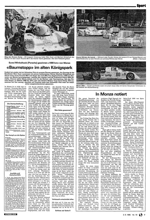 ... — Während vieler Runden führten die Lancia LC2 von Patrese/Nannini und Baldi/Wollek (hier vor dem Porsche von Lammers/Palmer) das Feld an. (Bilder J. Reinhard) In Monza ist es nicht zum erwarteten Economy-Run-Finale mit sehr knappem Entscheid gekommen, denn das bei sonnigem Wetter ausgetragene Rennen wurde von sehr heftigen Windböen beeinträchtigt, wobei das Rennen im Verlaufe der 1. Patrese/Nannini (Lancia LC 2). V 31,00" - 229,450 km/h Wollek/Saldi/Cesario (Lancia LC 2), 1 '32.20" 2. Palmer/Lammers (Porsche 956). 1'34,81" Mass/Ickx (Porsche 962 C), 1'35.09" 3. Bellof/Boutsen (Porsche 962 C). V35.18" Stuck/Bell (Porsche 956). V35.44" 4. Zorzi/Larrauri/Sigala (Porsche 956), 1'35,71" Winkelhock/Surer (Porsche 962 C), 1'35.79" 5. Fouche/Giacomelli (Porsche 956), V36.92" Gartner/Acheson [Porsche 956). V38.16" 6. Ludwig/Barilla (Porsche 956). 1'39,55" Lässig (Porsche 956). V40.18", usw. Beste C2-Qualifikationszeit: Facetti/ Finotto (Alba-Giannini-Carma), 1 '42.22' 35. Runde 1. Patrese/Nannini (Lancia LC 2), 1h 01'42,37"- 197,387 km/h; 2. Wollek/ Baldi (Lancia LC 2), 7,85" zurück; 3. Mass/Ickx (Porsche 962 C), 18,61" zurück; 4. Winkelhock/Surer (Porsche 962 C), 20.69" zurück; 5. Stuck/Bell (Porsche 956), 28.62" zurück; 6. ...
