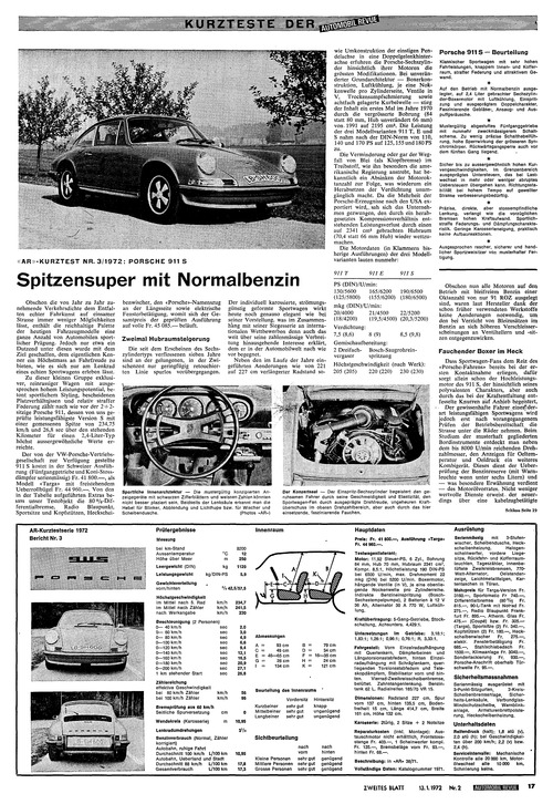 ... kostet in der Schweizer Ausführung (Fünfganggetriebe und Koni-Stossdämpfer serienmässig) Fr. 41 800.—, als Modell «Targa» mit freistehendem Ueberrollbügel Fr. 44 960.—. Von den in der Tabelle aufgeführten Extras besass unser Testobjekt die 80»/0-Differentialbremse, Radio Blaupunkt, Sportsitze und Kopfstützen, Heckscheibenwischer, den «Porsche»-Namenszug an der Längsseite sowie elektrische Fensterbetätigung, womit sich der Gesamtpreis der geprüften Ausführung auf volle Fr. 45 085.— beläuft. Die seit dem Erscheinen des Sechszylindertyps verflossenen sieben Jahre sind an der gelungenen, in der Zwischenzeit nur geringfügig retouchierten Linie spurlos vorübergegangen. Der individuell karossierte, strömungsgünstig geformte Sportwagen wirkt heute noch genauso elegant wie bei seiner Vorstellung, was im Zusammenh'ang mit seiner Siegesserie an internationalen Wettbewerben denn auch das weit über seine zahlenmässige Verbreitung hinausgehende Interesse erklärt, dem er in der Automobilwelt nach wie vor begegnet. Neben den im Laufe der Jahre eingeführten Aenderungen wie von 221 auf 227 cm verlängerter Radstand sowie Umkonstruktion der einstigen Pendelachse in eine Doppelgelenkhinterachse erfuhren die Porsche-Sechszylinder hinsichtlich ihrer Motoren die grössten Modifikationen. Bei unveränderter Grundarchitektur — Boxerkonstruktion, Luftkühlung, ...