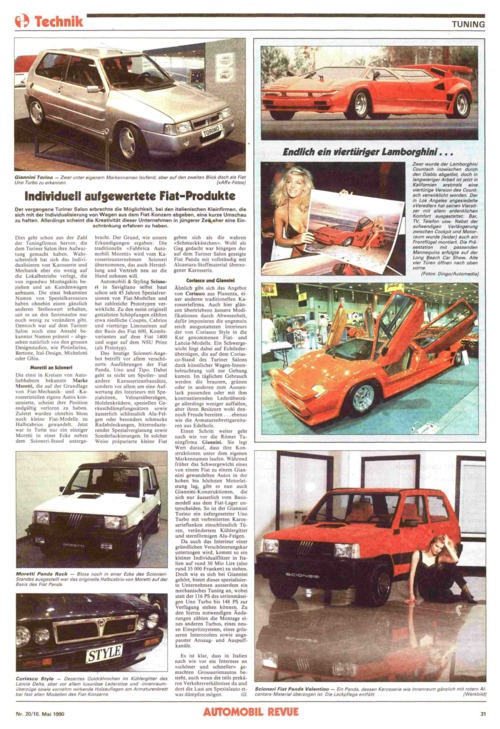 ... Dies geht schon aus der Zahl der Tuningfirmen hervor, die dem Turiner Salon ihre Aufwartung gemacht haben. Wahrscheinlich hat sich das Individualisieren von Karosserie und Mechanik eher ein wenig auf die Lokalbetriebe verlegt, die von irgendwo Montagekits beziehen und an Kundenwagen anbauen. Die einst bekannten Namen von Spezialkarossiers haben ohnehin einen gänzlich anderen Stellenwert erhalten, seit es an den Serienaut'os nur noch wenig zu verändern gibt. Dennoch war auf dem Turiner Salon noch eine Anzahl bekannter Namen präsent - abgesehen natürlich von den grossen Designstudios, wie Pininfarina, Bertone, Ital-Design, Michelotti oder Ghia. Die einst in Kreisen von Autoliebhabern bekannte Marke Moretti, die auf der Grundlage von Fiat-Mechanikund -Karosserieteilen eigene Autos konstruierte, scheint ihre Position endgültig verloren zu haben. Zuletzt wurden ohnehin bloss noch kleine Fiat-Modelle zu Halbcabrios gewandelt. Jetzt war in Turin nur ein einziger Moretti in einer Ecke neben dem Scioneri-Stand untergebracht. Der Grund, wie unsere Erkundigungen ergaben: Die traditionelle «Fabbrica Automobili Moretti» wird vom Karosserieunternehmen Scioneri übernommen, das auch Herstellung und Vertrieb neu an die Hand nehmen will. Automobili & Styling Scioneri in Savigliano selbst baut schon seit 45 Jahren Spezialversionen von Fiat-Modellen und ...