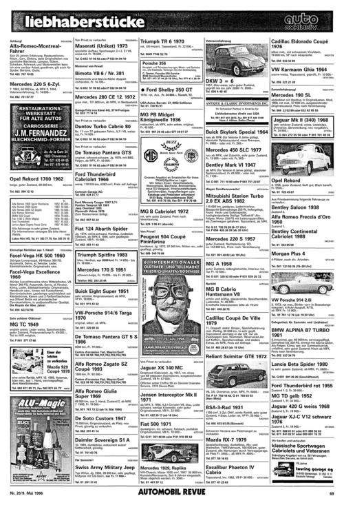 ... blau, Lederschwarz, wenige Kilometer, sehr guter Originalzustand, VB Fr. 22 000.- 43S31348 Tel. 01 422 30 17 (ab 18 Uhr Fiat 500 1971 dunkelgrün, Int. schwarz, Faltdach, perfekterOriginalzustand, VB Fr. 10 000.- 42T31245 Tel. G 01 361 48 04 oder P 01 910 88 62 Einer derletzten zu verkaufen Mazda 929Coupe 1978 Tel. 062 871 65 71, Fax 062 871 65 72 43836 eine echte Rarität, MFK 12. 1995, Automat,blau met., aus 1. Hand, servicegepflegt, dem Meistbietenden. VW Porsche 914 2.0i 3. 1973, rot met., Blinker vom in Stossstangeintegriert, 4-Rohr-Auspuff, R/TB, ab MFK Fr. 14 900- Tel. 01 761 12 76 ab 19.30 Uhr 31092 Gelegenheit für Sammler und Liebhaber!45S31191 BMW ALPINA B7 TURBO 1981 (Limousine), gar. 93 000 km, servicegepflegt,Dampfrad bis 330 PS, zinnrot mit Alpina-Dekor, Alu-Felgen, Klima, gar. nur Sommerbetrieb,unfallfrei, sehr guter Zustand, frisch ab MFK, Preis nach Vereinbarung. Tel. 052 337 36 76 Lancia Beta Spider 1980in sehr gutem Zustand, ab MFK, Fr. 6800- 38T30199kv Tel. G 031 991 26 26 (Geschäftszeit) Ford Thunderbird rot 1955 Zustand 1-2, Fr. 39 000.- MG TD gelb 1952Zustand 1, Fr. 34 900.- Jaguar 420 G weiss 1968Zustand 2, Fr. 19900- Jaguar XJ-C V12 schwarz 1976 Zustand 2, Fr. 19 9 00.- 45T30925 Tel. 071 888 01 51 oder 071 888 50 83Tel. 071 841 02 91 oder 089 601 16 35 Wir kaufen und verkaufen klassische Sportwagen Cabriolets und Veteranen Ständiges Angebot von ...