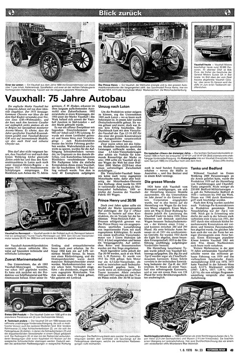 ... Version eines GM-«Weltmodells», und der kurz nach ihm lancierte Cavalier war anfänglich nichts anderes als ein in Belgien mit Spezialfront montierter Ascona/Manta. Es scheint, dass die Jahre spezifischer Vauxhall-Konstruktionen gezählt sind. Vauxhall-Besitzer GM setzt auf internationale Modelle, wie dies auch Ford und teilweise Chrysler tun. Dies darf aber nicht vergessen lassen, dass Vauxhall vor und nach dem Ersten Weltkrieg höchst glanzvolle Zeiten erlebt hat und dass den Konstruktionsbüros in Luton auch noch unter General-Motors-Regime - es begann 1925 - viele beachtenswerte Schöpfungen entsprangen. Ein Rückblick zum Anlass des 75. Jahres genieure, F. W. Hodges, erkannte im eben langsam aufkommenden Automobil eine Zukunftschance. 1902 entwickelte er einen Kleinwagen, der 1903 unter der Marke Vauxhalldas Werk befand sich unweit der Vauxhall Junction in Süd-London - auf den Markt gebracht wurde. Es war ein offener Zweiplätzer mit liegendem Einzylindermotor von 980 cm3 Inhalt und 5 PS Leistung. Er wurde mit einem Lenkhebel gesteuert und besass bloss zwei Vorwärtsgänge - zum Rückwärtsfahren musste das leichte Fahrzeug geschoben werden. Wahrscheinlich um Gewicht zu sparen, wurden für die Aufhängung Schraubenfedern verwendet, im Gegensatz zu den damals üblichen, vom Kutschenbau bekannten Blattfedern verschiedenster Form. Die Fachpresse lobte die ...