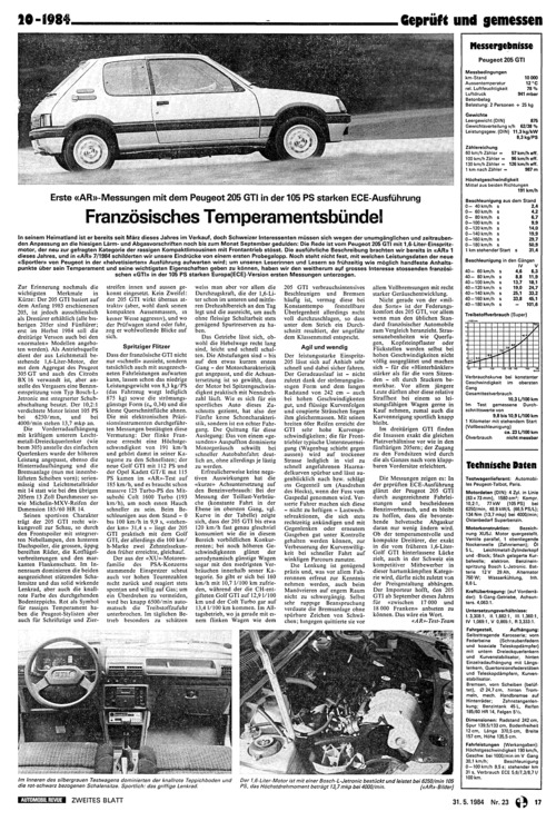 ... Im inneren des silbergrauen Testwagens dominierten der knallrote Teppichboden und Der 1,6-Liter-Motor ist mit einer Bosch-L-Jetronic bestückt und leistet bei 6250/min 105 die rotschwarz bezogenen Schalensitze. Sportlich: das griffige Lenkrad. PS, das Höchstdrehmoment beträgt 13,7mkp bei4000/min. («AR»-Bilder) Zur Erinnerung nochmals die wichtigsten Merkmale in Kürze: Der 205 GTI basiert auf dem Anfang 1983 erschienenen 205, ist jedoch ausschliesslich als Dreitürer erhältlich (alle bisherigen 205er sind Fünftürer; erst im Herbst 1984 soll die dreitürige Version auch bei den «normalen» Modellen angeboten werden). Als Antriebsquelle dient der aus Leichtmetall bestehende 1,6-Liter-Motor, der mit dem Aggregat des Peugeot 305 GT und auch des Citroen BX 16 verwandt ist, aber anstelle des Vergasers eine Benzineinspritzung vom Typ Bosch-L- Jetronic mit integrierter Schubabschaltung besitzt. Der 10,2:1 verdichtete Motor leistet 105 PS bei 6250/min, und bei 4000/min stehen 13,7 mkp an. Die Vorderradaufhängung mit kräftigem unterem Leichtmetall-Dreieckquerlenker (wie beim 305) anstelle des einfachen Querlenkers wurde der höheren Leistung angepasst, ebenso die Hinterradaufhängung und die Bremsanlage (nun mit innenbelüfteten Scheiben vorn); serienmässig sind Leichtmetallräder mit 14 statt wie bei den übrigen 205ern 13 Zoll Durchmesser sowie Michelin-MXV-Reifen der ...