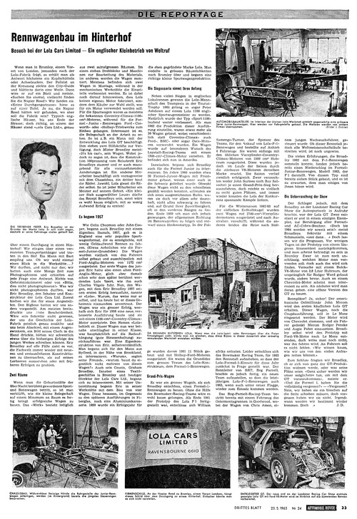... Zeit zum Photographieren und erhielten auf jede Frage eine Antwort. Nichts von Geheimniskrämerei oder von «Bitte, dies nicht photographieren!» Was wir nicht photographieren durften, war Eric Broadley, den Inhaber und Konstrukteur der Lola Cars Ltd. Zuerst hielten wir ihn für einen Angestellten. Den Bigboss hatten wir uns anders vorgestellt. Am meisten beeindruckte uns csine Bescheidenheit. Wäre sein Sekretär nicht gewesen, der uns die Geschichte der Lola- Fabrik peinlich genau erzählte und uns beim Abschied, mit einem Augenzwinkern, ein Bild seines Chefs in die Hand drückte, hätten wir schwerlich etwas über die bisherigen Erfolge des jungen Werkes schreiben können. Eric Broadley auf alle Fälle zieht es vor, die Fachwelt immer wieder mit neueren und erstaunlicheren Konstruktionen zu überraschen, als auf seinen Lorbeeren auszuruhen oder mit frü- heren Erfolgen zu prahlen. Wenn man die Geburtsstätte der über Nacht berühmt gewordenen Sport - und Rennwagen betritt, so ist man verblüfft, wie die kleine Belegschaft auf einem Minimum an Raum es fertig bringt erfolgreiche Wagen zu bauen. Das «Werk» besteht lediglich aus zwei mittelgrossen Räumen. Im einen stehen Drehbänke und Maschinen zur Bearbeitung des Materials, im anderen werden die Wagen montiert. Meistens befinden sich zwei Wagen in Montage, während in der mechanischen Werkstätte die Einzelteile ...