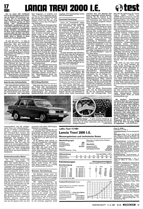 ... Lancia-Reihenvierzylinder Fiat-Derivate sind. Während der Fiat 132 (und kommende Argenta) allerdings einen längs eingebauten Motor und Hinterradantrieb aufweist, besitzen die Lancia Beta und Trevi Quermotor und Frontantrieb. Zur Serienausrü- stung des Trevi 2000 I.E. zählen auch ein 5-Gang-Getriebe, Servolenkung, ein Warnleuchten-Kontrollsystem und eine reichhaltige Ausstattung. Das ungewöhnlich gestaltete Interieur und Details der Karosserie stempeln den Trevi trotz herkömmlicher Stufenheckform zu einem echten Individualisten unter den heutigen Limousinen. Das eigenwillige Spur langsamer; er erreichte auch «bloss» 173 km/h gegenüber den genau 180 des Trevi. Auch hinsichtlich Beschleunigungsvermögen in den Gängen erwies sich der um 35 kg schwerere Lancia dem Fiat-Äquivalent überlegen. Das abweichende Leistungsverhalten des Trevi lässt sich auch aus den gegenüber dem Fiat anderen Untersetzungsverhältnissen von Getriebe und Antriebsachse erklären: Der Trevi ist kürzer untersetzt, und sein fünfter Gang ist weit weniger in Richtung «Spargang» ausgelegt als beim Fiat-Spitzenmodell. Demnach wäre beim Lancia auch ein höherer Benzinverbrauch zu erwarten gewesen. Doch unsere Messungen bewiesen erfreulicherweise das Gegenteil: Die Verbrauchskurve des Trevi 2000 I.E. verläuft ab 70 km/h deutlich tiefer als jene des gleich motorisierten Fiat. Bei konstanten ...