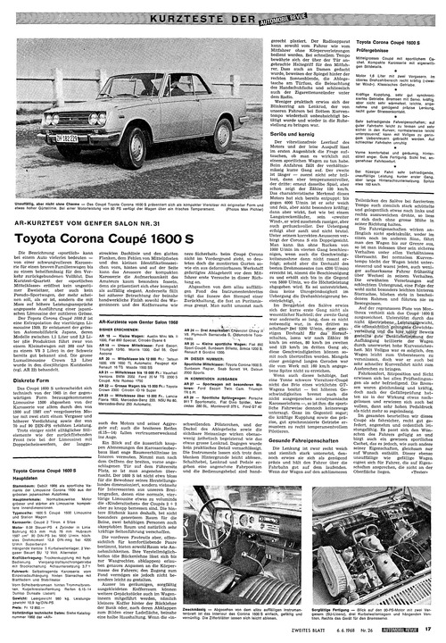 ... mit 360 cm3 bis zu einem V8 3 Liter) in der Schweiz bereits gut bekannt sind. Die grosse Luxuslimousine Crown 2,3 Liter wurde in den diesjährigen Kurztesten (vgl. AR 22) behandelt. Das Coupe 1600 S unterscheidet sich technisch von der 1965 in der gegenwärtigen Form herausgekommenen Limousine 1500 abgesehen von der Karosserie vor allem durch den von 1500 auf 1587 cm3 vergrösserten Motor mit zwei statt einem Vergaser und höherer Verdichtung sowie der von 70 auf 90 DIN-PS erhöhten Leistung. Trotz einiger nicht alltäglicher Stilelemente wie der zurückfliehenden Front (wie bei der Limousine) mit Doppelscheinwerfern, der langge- Toyota Corona Coupe 1600 S Hauptdaten Stammbaum: Debüt 1966 als sportliche Variante der Limousine Corona 1500 aus der grössten japanischen Autofirma. Hauptmerkmale: Normalbauweise. Motor grösser und stärker als Limousine, kompaktere Innendimensionen. Typenreihe: 1600 S Coupe 1500 Limousine und Station Wagon Karosserie: Coupe 2 Türen, 4 Sitze. Motor- 8,08 Steuer-PS 4 Zylinder in Linie Bohrung 80,5 mm Hub 78 mm Hubraum 1587 cm3 90 DIN-PS bei 5800 U/min, höchstes Drehmoment 12,8 DIN-mkg bei 4200 U/min Superbenzm Hängende Ventile 3 Kurbelwellenlager, 2 Vergaser Bauart SU 12 Volt. Alternator. Kraftübertragung: Trockenkupplung mit hydr Bedienung, Viergang-Vollsynchrongetriebe mit Stockschaltung Achsuntersetzung 3,71 Fahrwerk: Selbsttragende ...