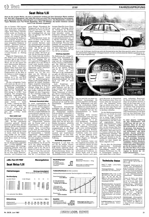... Karmann verantwortlich. Es handelt sich um einen kompakten Fünfsitzer in üblicher Quermotor/Frontantneb-Konfiguration. Einen ersten Test hatten wir dem Ibiza in «AR» 46/1985 gewidmet, wobei sowohl die 1,2- wie die 1,5-Liter-Variante in Prüfung standen. Wegen der Abgasnormen, die den Einbau eines Katalysators bedingen, gibt es den Ibiza bei uns nur noch mit dem 1,5-Liter- Motor, der für den Export mit einer elektronischen Benzineinspritzung Bosch LU-Jetronic dotiert wurde, bevor diese Ausführung auch in Spanien selbst auf den Markt kam. Trotz des Einheitsmotors ist der Ibiza in der Schweiz in nicht weniger als sechs Varianten verfügbar, nämlich als L, GL und GLX und dies jeweils dreioder fünftürig. Für den vorliegenden Testbencht stand uns die erst im vergangenen Jahr in Serie gegangene fünftünge Ausführung in dem mittleren Ausstattungsumfang GL zur Verfügung. Ihr Preis beträgt Fr. 14 500.- Zum Vergleich. Der preisgünstigste, bescheiden ausgestattete VW Polo 1.3 C - der zwar "gleich lang ist wie der Ibiza, aber auf einem um 11 cm kürzeren Radstand basiert - kostet Fr. 14 640.-, während der ebenfalls in Spanien gebaute Opel Corsa mit fünf Türen ab Fr. 14 250.- zu haben ist. Der preisgünstigste fünftürige Peugeot 205 (1.4/GL) kostet Fr. 13 650.- Die Benzineinspritzung hat dem Motor den im Testbericht von «AR» 46/1985 geforderten ...