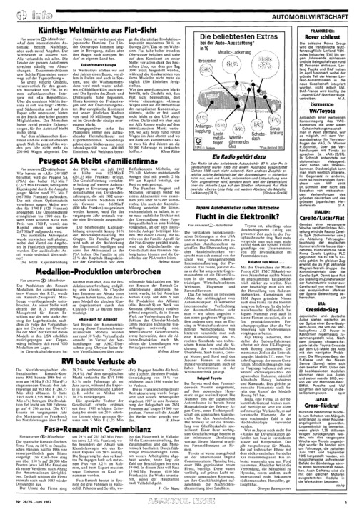 ... «Mittelund Südamerika sind auf dem Papier sehr interessant, bieten in der Praxis aber keine grossen Möglichkeiten. Die Menschen haben zuviel primäre Existenzsorgen, für den Autokauf bleibt nichts übrig. Auf dem afrikanischen Kontinent sind die Verkaufschancen gleich Null. In ganz Afrika werden pro Jahr nicht mehr als 200 000 Wagen abgesetzt. Der Ferne Osten ist vorderhand eine japanische Domäne. Die Länder Osteuropas kommen langsam in Bewegung, stellen aber ihre Wagen nach dortigem Bedarf im eigenen Land her. In Westeuropa erleben wir seit drei Jahren einen Boom, vor allem in Italien und auch in Spanien, und die Wachstumstendenz wird noch weiter anhalten.» Ghidella erklärt auch warum! Die Epoche des Zweitund Drittwagens habe begonnen. Hinzu kommen der Freizeitwagen und der Überalterungsfaktor. Der europäische Kontinent mit seiner jährlichen Kadenz von rund 10 Millionen Wagen sei im Grunde der einzige interessante Markt. Demgegenüber stehe das Phänomen immer neu auftauchender Herstellerländer mit Exportambitionen. Neuerdings gehöre dazu Südkorea mit einer Jahreskapazität von 400 000 Einheiten. Auf Weltbasis betrage die überzählige Produktionskapazität mindestens 30 %, in Europa 20 %." Das sei ein Wahnsinn. Fiat habe bisher trotzdem Oberwasser behalten und stehe auf dem Kontinent an erster Stelle: vor allem dank des ...