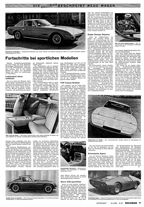 ... Teil als Kopfstützen ausgebaut sind. Die zwei Sitze des etwas knappen Fondabteils werden durch eine breite Armlehne getrennt. Das Armaturenbrett trägt in einem grossen, ovalen, direkt vor dem Fahrer liegenden Sammelträger die Instrumente mit runden Zifferblättern sowie die Kippschalter. Die als Ablegebrett ausgebildete Mittelkonsole Mehr Luxus als Raum — Das knapp dimensionierte, aber elegant gefertigte Fondabteil des Islero 400/GTS. Die längeren Vordersitzlehnen enthalten feste Kopfstützen. leistung etwas angehoben. Das Baumuster, das bisher als 400/GT bekannt war, hat seinen Namen in 400/GTS ge- ändert. Die äusseren Modifikationen umfassen horizontale Luftaustrittsöffnungen an den Flanken, eine vergrösserte Lufthutze auf der Motorhaube, in die Frontverschaltung eingelassene Nebellampen sowie ausgeweitete Radausschnitte, dank welcher der Wagen auf Wunsch mit breiteren Reifen (GR 70 VR 15 statt ^205 VR 15) ausgerüstet werden kann. Die Seitenscheiben sind nunmehr blau getönt, und die Tönung der oberen Zone der Frontscheibe wurde verstärkt. Die Türen sind mit Lüftungsflügeln versehen, während enthält ein besonderes Schliessfach. Sie trägt ausser dem Schalthebel auch die Schalter für das Aufklappen der verschalten Scheinwerfer und für die elektrischen Fensterheber, zwei seitliche Belüftungsöffnungen, zwei Innenlampen, zwei Aschenbecher und den ...