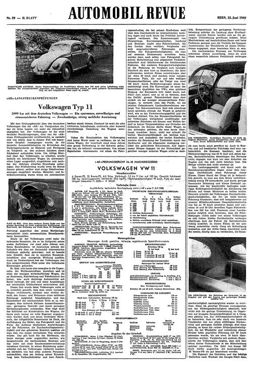 ... wurde deshalb ein fabrikneuer Wagen im schweizerischen Lager ausgewählt, eingefahren und nachher der üblichen scharfen Erprobung unterzogen. Das Prüffahrzeug wurde etwa im Monat Januar gebaut; seither sind einige Detailverbesserungen eingeführt worden. Materialund fabrikationsmässig waren schon am untersuchten PLATZ IM BUG. Unter dem vorderen Deckel findet man de« grossen Benzintank mit leicht zugänglichen Einfüllstutze^i, das Reserverad, das Werkzeug und etwas Raum für Kleinoepäcfc. Fahrzeug gegenüber den ersten Nachkriegsexemplaren nicht unwesentliche Einzelkorrekturen festzustellen. Heute ist der Volkswagen nicht mehr die technische Sensation, die er im Zeitpunkt seines ersten Auftretens vor rund zehn Jahren war. Seine Konstruktion ist inzwischen sowohl der Industrie wie dem am Automobil interessierten Publikum geläufig geworden; und es besteht kein Zweifel, dass sie in manchen Konstruktionsbüros eine anregende Wirkung ausübte. Auch im Verkaufspreis hat der Volkswagen den ihm entsprechenden Platz unter den lieferbaren Kleinwagen gefunden. Er lässt sich heute also zwanglos in die Typenreihe der Weltkonstruktiön einreihen und ist einer der wenigen wirtschaftlichen Wagen, die an Nutzraum, Fahrleistung und Fahrkomfort das bieten, was auch derjenige Automobilist mit Recht verlangt, der sich und seine Angehörigen mit minimalem Geldaufwand motorisieren will. ...
