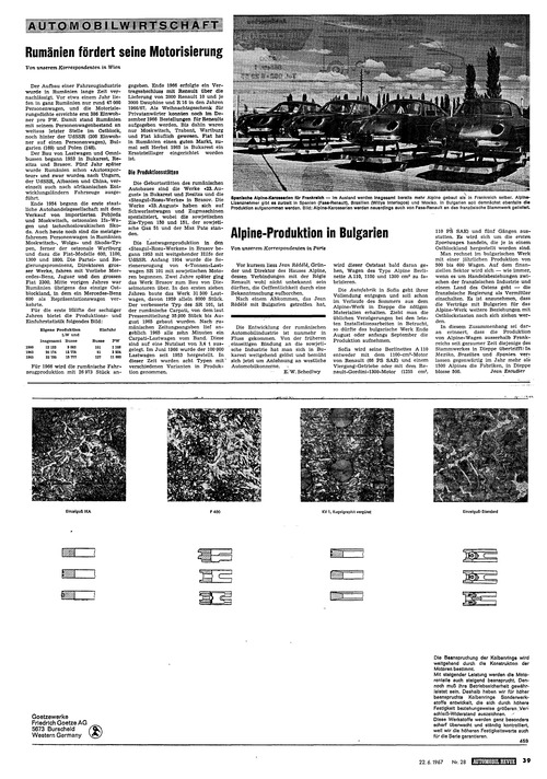 ... ostzonale Wartburg und dazu die Fiat-Modelle 600, 1100, 1300 und 1800. Die Parteiund Regierungsprominenz, Direktoren grosser Werke, fahren mit Vorliebe Mercedes-Benz, Jaguar und den grossen Fiat 2300. Mitte vorigen Jahres war Rumänien übrigens das einzige Ostblockland, in dem ein Mercedes-Benz 600 als Repräsentationswagen verkehrte. Für die erste Hälfte der sechziger Jahren bietet die Produktionsund Einfuhrstatistik folgendes Bild: Eigene Produktion LW und Insgesamt Busse I960 12 123 9 083 1963 20 174 13 778 1965 22 795 15 777 Einfuhr Busse PW 151 1188 81 3 934 127 11880 Für 1966 wird die rumänische Fahrzeugproduktion mit 26 973 Stück angegeben. Ende 1966 erfolgte ein Vertragsabschluss mit Renault über die Lieferung von 2000 Renault 10 und je 3000 Dauphine und R16 in den Jahren 1966/67. Als Weihnachtsgeschenk für Privatanwärter konnten noch im Dezember 1966 Bestellungen fürRenaults aufgegeben werden. Bis dahin waren nur Moskwitsch, Trabant, Wartburg und Fiat käuflich gewesen. Fiat hat in Rumänien einen guten Markt, zumal seit Herbst 1965 in Bukarest ein Ersatzteillager eingerichtet worden ist. Die Geburtsstätten des rumänischen Autobaues sind die Werke «23. August» in Bukarest und Resitza und die «Steagul-Rosu-Werke» in Brasov. Die Werke «23. August» haben sich auf Schwerlastwagen und Zugmaschinen spezialisiert, wobei die sowjetischen Zis-Typen 150 ...