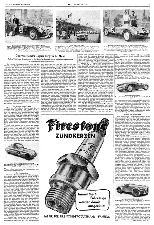 ... der Leistungswertung siegt jenes Fahrzeug, das die relativ grösste Überschreitung der nach Hubraum abgestuften Sollstrecken erzielt. walkerwhitehead Gesamtsieger — De Montremy-Hemard Sieger im Leislungsklasseinent (Von unserem Spezialberichterstatter) Das grosse Sportwagenrennen um die «24 Stunden von Le Mans» hat dieses Jahr zu einem Triumph der englischen Industrie geführt, die sich ganz besonders intensiv auf diesen Anlass vorbereitet hatte. Eine neue, leichtere und stärkere Ausgabe des Jaguar XK 120, die für die Oeffentlichkeit völlig überraschend auftauchte, errang den Sieg in neuer Rekorddistanz. Die favorisierten Talbot mussten mit dem zweiten und vierten Platz vorliebnehmen, während die weniger schnellen Aston Martin und ein neuer Nash- Healey-Prototyp sich die übrigen ersten Ränge sicherten. Weder der an 8. Stelle figurierende Ferrari «America« von Chinetti noch die amerikanischen Cunningham waren in der Lage, entscheidend einzugreifen, dagegen überraschte der weitgehend serienmässige Lancia-Aurelia-Zweiliter wieder mit einer guten Leistung. Die beiden Piloten des Siegerwagens, Peter Walker und Peter Whitehead, gehören zu den bestbekannten englischen Rennfahrern. Infolge des schlechten Wetters ereigneten sich zahlreiche Unfälle, von denen einer dem Franzosen Lariviere (Ferrari) das Leben kostete. Die detaillierten Resultate sind auf Seite 6 ...