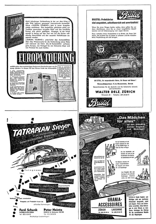 ... Kartenwerk Beschreibungen von 24 europ. Ländern. In diesem Teil des Führers findet der Automobilist Text in deutscher,französischer und in englischer Sprache. Europa Touring ist in allen guten Buchhandlungen und auf den Clubsekretariaten zum Preise von Fr. 18.50 erhältlich. VERLAG HALLWAG BERN Verlangen _Sie ganz unverbindlich Prospekte und Probefahrt durch die Wenn Sie einen Wagen kaufen wollen, dann sollten Sie nur dann abschliessen, wenn Sie zu einem vorgeführten Modell spontan und mit Ueberzeugung «ja » sagen können. Dazu verhelfen Ihnen Probefahrten ä la Bristol, die Ihnen Zeit lassen, die Funktion bis ins Letzte zu erfassen und die trotzdem keine Verpflichtung mit sich bringen. Für die Ferienreise mit viel Gepäck verstauen Sie ades auf dem URANIA-Träger. Sa haben Sie Plafe im Wagen. Für den Handwerta und Vertreter wie auch für den Kundendienst des Oetaillistenzweckmässig und stabil. HatlerausöurnmizurnFestklemmen der Ski. Halter aus Metall mit starker Metallfeder für Ski. Für Skifahrer, »ersehen mit unseren Spezial-Skihaltern. der bequeme und sichere Skiund Gepäckträger. Gummiriemen m. Hakken in versch. Längen zum raschen Befestigen v. 6epäckstückea Zum Einlaufen oder wm Sonntags-Picnic, wo Sie den Kinderwagen mitnehmen wollen, die ideale Lösung. Wasserdichte Segeltuchblachen in versch. ssen z. Bedecken und Befestigen von 6epäck. URANIA Combi Gepäck- ...