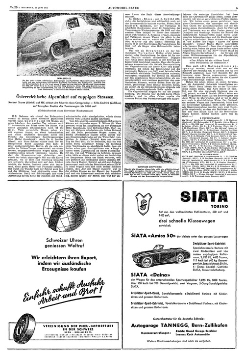... unvermittelt vor einembreiten, entgegenkommenden Wagen sahen. Ein Zusammenstoss konnte vermieden werden. Daaber die Strassenunterlage «lebendig» war, wurde der brüsk abgestoppte MG aus der Kurvegetragen, wo er über eine Böschung hinunter sich seitwärts überschlug und auf dem Rückenlandete, die beiden Insassen unter sich begrabend, einen guten Meter vom Flussufer entfernt. Wie durch ein Wunder kam der Fahrer ganz heil und der Mitfahrer (und gleichzeitig unser Berichterstatter. Red.) mit Schürfungen und einer Quetschung davon: hätte der Rahmen der Windschutzscheibe nicht standgehalten, würde diesenBericht wohl jemand anders schreiben. Von den anderen ausgeschiedenen Schweizernkönnen wir folgendes sagen: P. Göhner (St. Margrethen) erlitt am Bergrennen an der TurracherHöhe Kupplungsund Getriebedefekt. Dort sahen wir übrigens mindestens ein halbes Dutzendauf die Seite geschobene Wagen stehen. K. Bächli (Niederlenz) musste schon vorher wegen Stossdämpferbruchs auf die Weiterfahrt verzichten. A. Junker <Zürich) kam am zweitenTag bis Bad Tölz, als er feststellte, dass ein von einem Stein erhaltener Schlag die Richtungeines Vorderrades so abgefälscht hatte, dass ein Reifen schon ganz durchgefahren war. « Beppi»büsste einen Gummiblock an einem Stossdämpfer ein, was mit Werkzeug zu beheben gewesenwäre, hätte er dieses nicht vorher am berüchtigten Bergrennen Stück ...