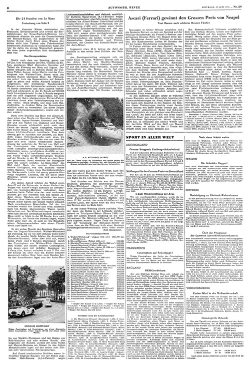 ... unterboten und dann laufend verbessert und schliesslich in der 31. Runde auf 169,355 km/h hinaufgeschraubt. In der 5. Runde ereignetesich ein sehr tragischer Unglücksfall, bei dem der von der Bahn abgekommene Ferrari-FahrerLariviere durch eine Drahtabsperrung das Leben verlor. (Sind Drähte, und dazu noch Stacheldrähte, in direkter Nähe der Rennstrecken wirklich nicht zu vermeiden? Die bösen Folgendieser «Sicherungsmassnahmen> zeigen sich immer wieder.) Nach zwei Stunden lag Moss mit seinem Jaguar schon eine Runde vor Gonzales auf Talbot, den beiden Jaguar-Fahrern Biondetti und Walker und den Talbot von Chaboud und Rosier. Gonzales musste schliesslich auch noch demDruck der beiden Jaguar nachgeben, während sich hinter Rosier an siebenter Stelle Hall aufeinem 4,1-Liter-Ferrari installierte. Eine Aenderung gab es zunächst nur insofern, als Biondetti wegen Oelleitungbruchs nach etwa 4>^ Stunden ausschied. Hinter der nun aus zwei Jaguar und zwei Talbot bestehenden Spitzengruppe lag weiterhin der Ferrari von Hall undder Cunningham der Amerikaner Walters- Fitch (übrigens derjenige ohne Zusatzgetriebe!).Inzwischen waren verschiedene Ausfälle zu verzeichnen. Der 4,1-Liter-Ferrari von Helde-Chiron wurde wegen vorschriftswidrigen Tankens auf der Strecke in der 29. Runde aus dem Rennen genommen. Somit erreichte der Monegaske auch bei seinem sechsten ...