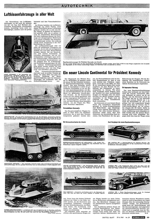 ... sind vor allem für militärische Transporte von Interesse, da sie sich auf unwegsamem Gelände wie auch über Wasserflächen bewegen können. Bei der Konstruktion sind weitere Fortschritte im Leichtbau festzustellen, und die Antriebssysteme unterliegen noch weiteren Verfeinerungen. Unsere Bilder zeigen verschiedene Konstruktionen aus der jüngsten Zeit. Da Aufhängungsund Kraftübertragungsfragen bei diesen radlosen Fortbewegungsmitteln nicht gelöst werden müssen, hat ihre Konstruktionen mehr mit dem Flugzeugund Schiffsbau gemeinsam. Viele Verwendungsmöglichkeiten sind aber auch im zivilen Verkehr gegeben, vor allem steht eine ganz wesentliche Erhöhung der Reisegeschwindigkeiten auch bei Schienenfahrzeugen auf Luftkissen und bei Geländefahrzeugen bevor. -nn- AEROMOBILE 200 — Ein von einem amerikanischen Arzt, Dr. W. R. Bertelsen, konstruiertes Luftkissenfahrzeug. Die für das Anheben und die Fortbewegung erforderliche Motorkraft beträgt 200 PS. Die Höchstgeschwindigkeit wird mit 96 km/h angegeben. Da$ Fahrzeug bewegt sich über Land und Wasser. JAPANISCHES AEROMOBIL — Das japanische Inselreich bietet viele Anwendungsmöglichkeiten für Lüftkissenfahrzeuge. Die hier gezeigte Konstruktion war am Automobilsalon in Tokio ausgestellt (ATP). Der 6,4 m lange Wagen kann mit drei verschiedenen Dachaufbauten versehen werden, deren Teile im Bild vor dem ...