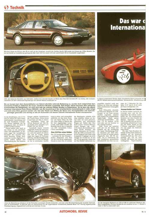... die europäischen Hersteller ihre neuesten Produkte lancieren. Einige Weltneuheiten wurden allgemein erwartet, andere stellten eine Überraschung dar. Zur letzteren Gruppe gehörte beispielsweise der Toyota Paseo. Dieses kleine Coupe baut auf dem in Amerika verbreiteten Tercel mit 238 cm Radstand auf. Der Paseo besitzt einen potenten 1,5-1- DOHC-16V mit 100 PS. Ausserhalb Japans erstmals ausgestellt wurde der neue grosse Honda Legend mit Längsmotor, und zwar gleich als Limousine und als Coupe. Subaru zeigte den Legacy in Turboausführung, und das künftige SVX- Coupe mit 3,3-Liter-V6-Maschine war in seriennaher Ausführung zu sehen, weit seriennäher jedenfalls, als dies beim Prototyp vom Salon Tokio der Fall war. Zwar fehlte in Detroit das für Juni angekündigte Lexus- Coupe, doch dafür wurden die Besucher durch das in Amerika von ASC verwandelte Celica- Cabrio entschädigt. Neu« «Full Sizc» setzen Zeichen Die US-Autohersteller scheinen - zumindest für den Moment - punkto Denkweise und Elan von der Golf-Krise ungebremst. Gerade in einer Zeit, in welcher der Benzinpreis sichtlich nach oben abdriftet, fuhren sie einmal mehr mit noch grösseren, schwereren und luxuriöseren Wagen auf. Neben dem Duo Ford Crown Victoria/Mercury Grand Marquis (vgl. «AR» 2/91) feierte der brandneue Cadillac Seville Premiere. Die grosse Limousine mit Frontantrieb der ...