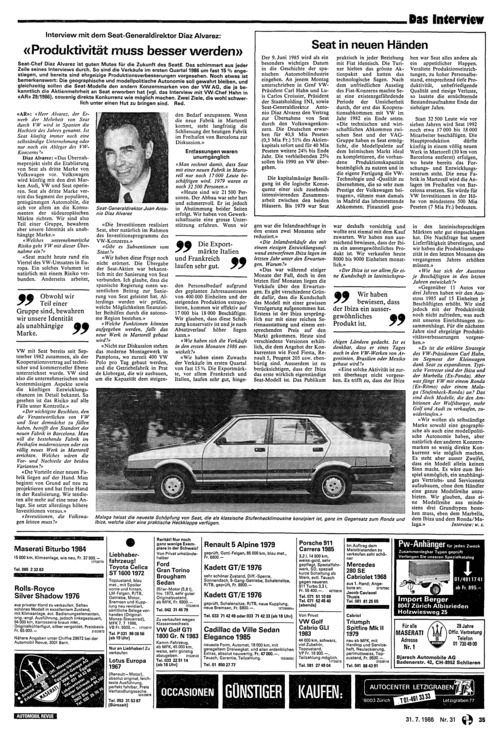 ... Silber vergoldet, Preisbasis Fr. 65 000.- 31S29672 geprüft, Gotti-Felgen, 85 000 km, blau met..Fr. 6800.- sehr schöner Zustand, Diff .-Sperre, Sonnendach, 5-Gang-Getriebe, Schalensitze, R/TB, geprüft. Fr. 8800.- geprüft, Schalensitze, R/TB, neue Kupplung, neue Bremsen, Fr. 6800. — . 12T290661 Cadillac de Ville Sedan Elegance 1985 neueste Form, Automat, 18 000 km, mit geregeltem Dreiwegkat. und allen erdenklichen Extras, absolut neuwertig, Fr. 47 000.—. Bjarsch Automobile AG Badenerstr. 42, CH-8952 Schlieren Malaga heisst die neueste Schöpfung von Seat, die als klassische Stufenhecklimousine konzipiert ist, ganz im Gegensatz zum Ronda undIbiza, welche über eine praktische Heckklappe verfügen. Seat-Generaldirektor Juan Antonio Diaz Alvarez Der 9. Juni 1985 wird als ein besonders wichtiges Datum in die Geschichte der spanischen Automobilindustrie eingehen. An jenem Montag unterschrieben in Genf VW- Präsident Carl Hahn und Luis Carlos Croissier, Präsident der Staatsholding INI, sowie Seat-Generaldirektor Antonio Diaz Alvarez den Vertrag zur Übernahme von Seat durch den Volkswagenkonzern. Die Deutschen erwarben für 40,8 Mia Peseten (0,5 Mia Fr.) 51% des Aktienkapitals sofort und für 40 Mia Peseten weitere 24% bis Ende Jahr. Die verbleibenden 25 1/2 sollen bis 1990 an VW übergehen. Die kapitalmässige Beteiligung ist die logische Konsequenz einer sich ...