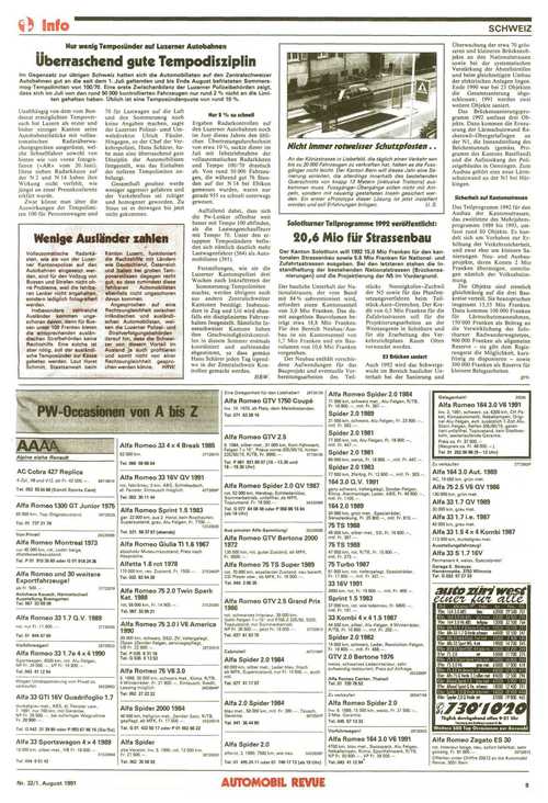 ... Renault AC Cobra 427 Replica 4-Zyl., V8 und V12, ab Fr. 42 000. — . 54T19019 Tel. 052 53 24 68 (Künzli Sports Cars) Alfa Romeo 1300 GT Junior 1975 65 000 km, Top-Originalzustand. 34T20025 Tel. 01 737 31 78 Von Privat! 26S20089 Alfa Romeo Montreal 1973 nur 45 000 km, rot, Leder beige,Wettbewerbszustand Tel. P 01 910 35 60 oder G 01 918 2435 Alfa Romeo und 30 weitere Exportfahrzeuge!ab Fr. 500. —. 37T2207P Autohaus Keusch. HermetschwilAusstellung Bremgarten Tel. 057 33 09 09 Alfa Romeo 33 1.7 Q.V. 1989 rot, nur Fr. 11 600. —. 37T20435 Tel. 01 844 47 00 Vorführwagen! 29T20522 Alfa Romeo 33 1.7e 4 x 41990 Sportwagen, 4500 km, rot, Alu-Felgen,NP Fr. 24 000. -, VP Fr. 16 800. - Tel. 043 41 12 94 Wegen Umdisponierung von Privat zuverkaufen 34S20602 Alfa 33 GTI16V Quadrifoglio 1.7 dunkelgrau met., ABS, el. Fenster usw.,7. 1991, nur 700 km, mit Garantie NP Fr, 26 500 —, bei sofortiger WegnahmeFr. 20 900. -. Tel G 042 31 39 80 oder P 093 67 46 15 (Sa/So) Alfa 33 Sportswagon 4x4198916 000 km, Silber met., VB Fr. 18 000. — 37S20664 Tel 044 6 51 42 Nr. 32/1. August 1991 Alfa Romeo 33 4 x 4 Break 1985 62 000 km 27T20670 Tel. 066 56 68 04 Alfa Romeo 3316V QV 1991 rot, fabrikneu, 0 km, ABS, Schiebedach,el. Fenster, Eintausch möglich. 42T2959P Tel. 053 3511 44 Alfa Romeo Sprint 1.5 1983gar. 22 000 km, aus 2. Hand, kein Rostbaufen, Superzustand, grau, Alu-Felgen, Fr. 7700. —12S20630 Tel. ...
