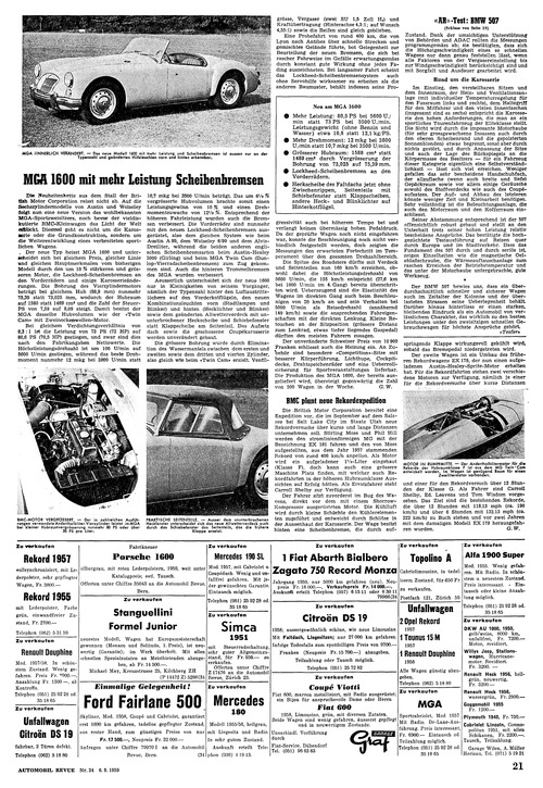 ... statt 1489 cm» und die Zahl der Steuer- PS von 7,59 auf 8,09 steigt. Damit besitzt der MGA dasselbe Hubvolumen wie der «Twin Cam» mit Zweinockenwellen-Motor. Bei gleichem Verdichtungsverhältnis von 8,3:1 ist die Leistung von 73 PS (72 HP) auf 80,6 PS (79,5 HP) gestiegen, und zwar sind dies nach den Fabrikangaben Nettowerte. Die Höchstleistungsdrehzahl ist um 100 U/min auf 5600 U/min gestiegen, während das beste Drehmoment nunmehr 12 mkg bei 3800 U/min statt 10,7 mkg bei 3500 U/min beträgt. Das um 6% % vergrösserte Hubvolumen brachte somit einen Leistungsgewinn von 10 % und einen Drehmomentzuwachs von 12V* %. Entsprechend der höheren Fahrleistung wurden auch die Bremsen verbessert. Die Vorderräder sind nunmehr mit den neuen Lockheed-Scheibenbremsen ausgerüstet, also dem gleichen System wie beim Austin A 99, dem Wolseley 6/99 und dem Alvis- Dreiliter, während die beiden anderen englischen Scheibenbremsarten beim Austin-Healey 3000 (Girling) und beim MGA Twin Cam (Dunlop-Vierradscheibenbremsen) zum Zug gekommen sind. Auch die hinteren Trommelbremsen des MGA wurden verbessert. Aeusserlich unterscheidet sich der neue 1600 nur in Kleinigkeiten von seinem Vorgänger, nämlich der Typenzahl hinter den Luftaustrittslöchern auf den Vorderkotflügeln, den neuen Kombinationsleuchten vorn (Stadtlampen und Blinker) und hinten (Hecklichter und Blinker) sowie dem geänderten ...