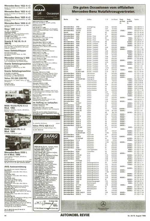 ... Fahrzeuge sind zwischen 18 und 24 Monate alt, ca. 45 000 bis 50 000 km. Verlangen Sie unsere Offerte. 40S3224N Tel. 01 809 18 18 oder 077 66 40 70Fax 01 810 00 47 IVECO 35.10, Brücke , Verdeck, Hebeb01.89, Km 162000, guter Zustand Mercedes 409D, Brücke offen01.88, NL 1400 Kg, MFK Ford Transit 100L, Kastenw.verglast,03.93, NL 1205Kg, MFK Ford Transit 100L Kleinbus 3+9 Pers 06.93, weiss, mit GepäckanhängerMercedes 1117, Brücke, Verdeck, 09.88,129000 Km, MFKVolvo F611, Kasten, Hebebühne 07.86,426000km, sehr gepflegtMercedes 1933, Brücke. Verd. Hebeb. 07.83, 646000km,MFK, gepflegt. IVECO 190.33, Brücke, Hebebühne 08.86, 700000km, SchlafkabineIVECO 260.33,6x4, Brücke, Hebeb. 11.86,767000km, SchlafkabineIVECO-Maglrus 160M8,4x4 02.81, Brücke 3,5m, SchlepperfahrzeugAnhängelast 23To, MFK UNIMOG U1000L, 424, 03.79, KipperIVECO 95.14, Kühlwagen, Hebebühne 07.87, Thermoking 1993,237000Km,DAF FT3305, Sattelschlepper, 08.87, Km 550000, MFKMercedes 1628 Sattelschlepper 09.81, Luftfed. ABS, 1 Liege, schönMaglrua Deutz 310 Sattelschlepper 06.76, grosser Kabine, Fr.6000.003-Ach# Krone Sattelauflieger 12,5m 2-Achs Kühlanhänger 12T, Hebebü..ab MFK, 2,5m, sehr guter Zustand. 2-Achs Anhänger. Isotherm, 12t, 2,5m Wir vermieten LKW und Anhänger w«tt St. Gallen N20 3 I _ Auffahrt:— rwganaoon NI Bern/Basel — ,/ Zürich 6km w BAFAGöf ^ f Trockenloostrnsse 61 8105 Regensdorff Telefon ...