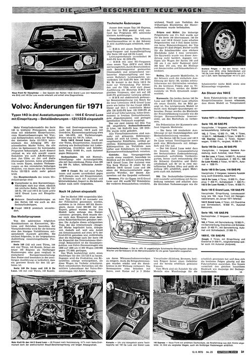 ... statt nur einer, nämlich 140 (einfache Reihe, Ersatz für 121/ 122 S), 140 und 140 S de Luxe sowie 140 E Grand Luxe mit Einspritzmotor. # Mehrere Detailveränderungen an. den Serien 140 wie auch an den Sechszylindertypen. # Coupe 1800 E praktisch unverändert. Von den zahlreichen möglichen Kombinationen an Karosserien, Motoren und Getrieben besonders der Vierzylinderreihe wird für die Schweiz eine den hiesigen Verhältnissen entsprechende Auswahl getroffen. Sie umfasst folgendes, in der beigegebenen Aufstellung zusammengefasstes Programm: Serie 140 (142 mit zwei Türen, 144 mit vier Türen, 145 Kombi, ferner ein neuer 145 Express als fünftüriger Kastenwagen oder ganz verglast) in einfacherer Karosserieausstattung. Ihre Preise sind besonders in der zweitürigen Ausführung so kalkuliert, dass ein gewisser Ersatz für den 121 geboten ist. Serie 140 De Luxe und 140 S De Luxe. 144 mit vier Türen, 145 Kombi. Einund Zweivergasermotoren, 144 auch mit Automat, 144 S auch mit Overdrive. Karosserieausstattung etwa wie 140-1970, mit Verfeinerungen. Preise etwa bis 700 Fr. höher. Serie 140 E Grand Luxe. 144 E mit vier Türen, Einspritzmotor, Innenausstattung wie Sechszylinder mit Lederpolsterung, Overdrive und Schiebedach. Preis 18 900 Fr., auch Automat gegen Mehrpreis. Sechszylinder. 164 mit Normal-, Schnellgangoder Automatgetriebe, alle mit Servolenkung, ...