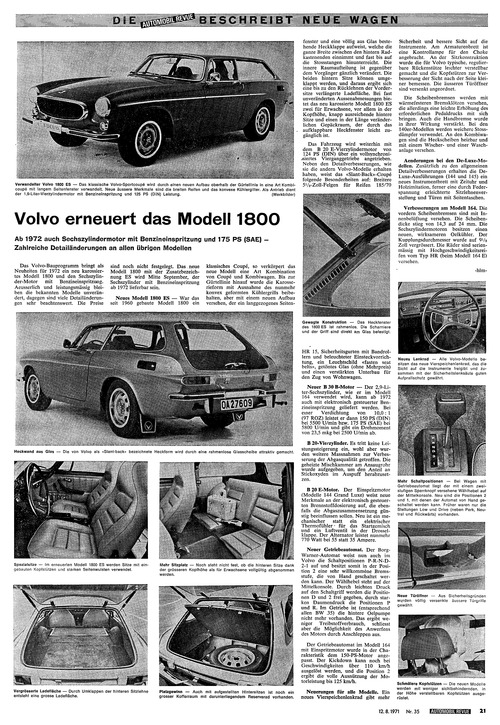 ... 1800 ein klassisches Coupe, so verkörpert das neue Modell eine Art Kombination von Coupe und Kombiwagen. Bis zur Gürtellinie hinauf wurde die Karosserieform mit Ausnahme des nunmehr konvex geformten Kühlergrills beibehalten, aber mit einem neuen Aufbau versehen, der ein langgezogenes Seiten- Spezialsitze — Im erneuerten Modell 1800 ES werden Sitze mit eingebauten Kopfstützen und starken Seitenwulsten verwendet. Mehr Sitzplatz — Noch steht nicht fest, ob die hinteren Sitze dank der grösseren Kopfhöhe als für Erwachsene vollgültig abgenommen werden. fenster und eine völlig aus Glas bestehende Heckklappe aufweist, welche die ganze Breite zwischen den hintern Radkastenenden einnimmt und fast bis auf die Stossstangen hinunterreicht. Die innere Raumaufteilung ist gegenüber dem Vorgänger gänzlich verändert. Die beiden hintern Sitze können umgeklappt werden, und daraus ergibt sich eine bis zu den Rücklehnen der Vordersitze verlängerte Ladefläche. Bei fast unveränderten Aussenabmessungen bietet das neu karossierte Modell 1800 ES zwei für Erwachsene, vor allem in der Kopfhöhe, knapp ausreichende hintere Sitze und einen in der Länge veränderlichen Gepäckraum, der durch das aufklappbare Heckfenster leicht zugänglich ist. Das Fahrzeug wird weiterhin mitdem B 20 E-Vierzylindermotor von 124 PS (DIN) über ein vollsynchroni-/siertes Vierganggetriebe angetrieben. ...