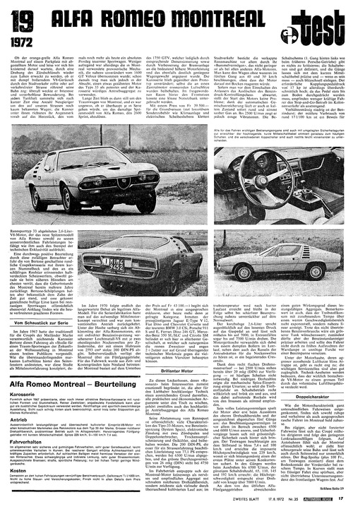 ... dann still um den Traumwagen von Montreal, und es war ungewiss, ob er überhaupt je in Serie gehen würde, um das damalige Spitzenmodell von Alfa Romeo, den 2600 Sprint, abzulösen. des 1750 GTV, welcher lediglich durch entsprechende Dimensionierung sowie durch Verbesserung der Bremsanlage an die bedeutend höhere Motorleistung und das ebenfalls deutlich gestiegene Wagengewicht angepasst wurde. Die Karosserie blieb gegenüber dem Prototvp unverändert; selbst die an einen Zentralmotor erinnernden Luftschlitze wurden beibehalten. Im freigewordenen Raum hinter den Frontsitzen konnte eine kleine Notsitzbank untergebracht werden. Mit einem Preis von Fr 39 500.— für die Grundversion (mit luxuriösem Sonderzubehör wie Klimaanlage und elektrischen Scheibenhebern klettert Stadtverkehr besticht die verkappte Rennmaschine vor allem durch ihr «Bummelvermögen», das nicht geringer ist als bei allen anderen Alfa-Motoren. Man kann den Wagen ohne weiteres im fünften Gang aus 40 und 50 km/h beschleunigen, ohne dass der Motor darauf mit Bocken reagieren würde. Sofern man vor dem Einschalten des Anlassers das Auslöschen des Benzindruck-Kontrollämpchens abwartet, stellt der Start des Motors keine Probleme; dank der automatischen Gemischanreicherung läuft er auch in kaltem Zustand sofort rund und nimmt sauber Gas an. Bis 2500 U/min zeigt er jedoch einige Vibrationen. Die Be- ...