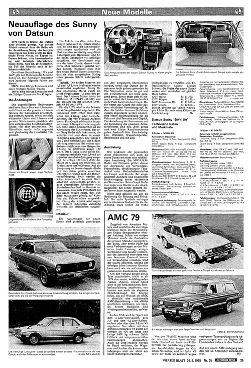 ... tiefer angesetzt und gleichzeitig die Glasfläche vergrössert. Hinten im Coupe: etwas enge Verhältnisse. Ungewohnte Schaltebene des Fünfganggetriebes. Die Abkehr von allzu vielen Rundungen wird auch in Details ersichtlich. So sind etwa die Scheinwerfereinfassungen quadratisch und die Heckleuchten rechteckig ausgeführt. Kühlergrill und Heckwand sind bei der neuen Generation viel gefälliger ausgeführt. Am deutlichsten zeigt sich das beim Coupe, dessen Heckpartie ohne Schnörkel gestaltet werden konnte. Insgesamt muss man den neuen Datsun Sunny attestieren, dass sie dem europäischen Styling einen grossen Schritt nähergerückt sind. Technik. Die beiden Motoren mit 1,2 und 1,4 Litern Hubraum werden unverändert angeboten. Einzig für den japanischen Markt wurde ein leicht vergrösserter 1,2-Liter neu gebaut. Der kleinere Motor leistet bei 5600/min 52 DIN-PS (38 kW) und der grössere bei der gleichen Drehzahl 63 PS (46,5 kW). Für die 120Y wird in der Schweiz ein 4-Gang-Getriebe angeboten. Die Limousine 140Y erhält man wahlweise mit 4-Gangoder Getriebeautomat, der 950 Franken Aufpreis kostet. Das Coupe schliesslich ist nur mit einem 5-Gang-Getriebe ausgerü- stet. Eine kleine Besonderheit ist die Anordnung der Schaltebene. Der erste Gang findet sich links unten, die weiteren vier sind dann in einem H-Schema angeordnet. Die Gänge 1 und 2 sind ziemlich kurz, ...