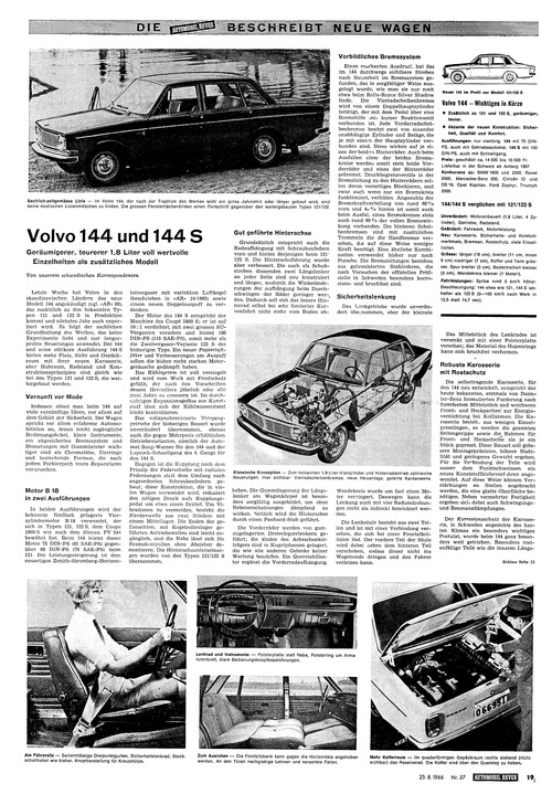 ... dem Gebiet der Sicherheit. Der Wagen spricht vor allem erfahrene Automobilisten an, denen leicht zugängliche Bedienungshebel, klare Instrumente, ein abgesichertes Bremssystem und Stossstangen mit Gummileister' wichtiger sind als Chromstäbe, Zierringe und bestechende Formen, die nach jedem Parkierpech teure Reparaturen verursachen. Motor B 18 in zwei Ausführungen In beiden Ausführungen wird der bekannte fünffach gelagerte Vierzylindermotor B18 verwendet, der sich in Typen 121, 122 S, dem Coupe 1800 S wie auch dem älteren PV 544 bewährt hat. Beim 144 leistet dieser Motor 75 DIN-PS (85 SAE-PS) gegen- über 68 DIN-PS (75 SAE-PS) beim 121. Die Leistungssteigerung ist dem neuartigen Zenith-Stromberg-Horizontalvergaser mit variablem Luftkegel (beschrieben in «AR» 24/1965) sowie einem neuen Doppelauspuff zu verdanken. Der Motor des 144 S entspricht der Maschine des Coupe 1800 S; er ist auf 10 :1 verdichtet, mit zwei grossen SU- Vergasern versehen und leistet 100 DIN-PS (115 SAE-PS), somit mehr als die Zweivergaser-Variante 122 S des bisherigen Typs. Ein neuer Papierlujtfilter und Verbesserungen am Auspuff sollen die bisher recht starken Motorgeräusche gedämpft haben. Das Kühlsystem ist voll versiegelt und wird vom Werk mit Frostschutz gefüllt, der nach den Vorschriften dessen Herstellers jährlich oder alle zv/ei Jahre zu erneuern ist. Im durchsichtigen ...