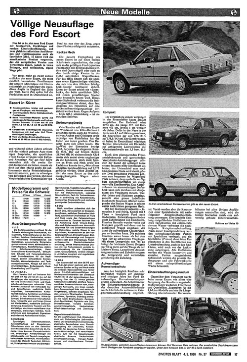 ... Bauweise, Limousinen mit drei oder fünf Türen, dreitüriger Kombiwagen. Vom und hinten Einzelradaufhängung. Preis ab 11 490 bis über 17 000 Franken. und während sieben Jahren erfreute sich das einfach gebaute Auto eines regen Zuspruchs, die sportlichen «Twin Cams» errangen viele Rallyeund Rennsiege. Nur gut fünf Jahre vermochte .sich die zweite Escort-Generation zu halten, musste sie doch auf dem Markt gegen die aufkommende starke Fronttrieblerkonkurrenz antreten, ganz zu schweigen von derjenigen aus Fernost. Die neue Vorderradantriebs-Konstruktion von Ford hat nun eher das Zeug, gegen diese Phalanx erfolgreich anzutreten. Die äussere Formgebung des neuen Escort ist auf einen breiten Käuferkreis zugeschnitten, das zeigt sich an der gefälligen Fordtypischen Frontpartie mit Breitbandscheinwerfern und Querstabgrill oder auch an den durch einige Kanten in der Höhe aufgeteilten Wagenflanken. Für das Heck Hessen sich die Stylisten etwas Eigenständiges einfallen, das sich von dem üblichen Schrägheck-Eintopf wohltuend abhebt. Denn der Escort erhielt ein «Entenheck», das beim sportlichen XR-3 mit einem grossflächigen Spoiler ganz besonders betont wird. Dieses kurze Stufenheck verbessert die Strö- mungsverhältnisse derart, dass laut Angaben des Herstellers auf eine Heckscheibenreinigungsanlage verzichtet werden kann. Gegen Aufpreis - beim XR-3 serienmässig - ist ...