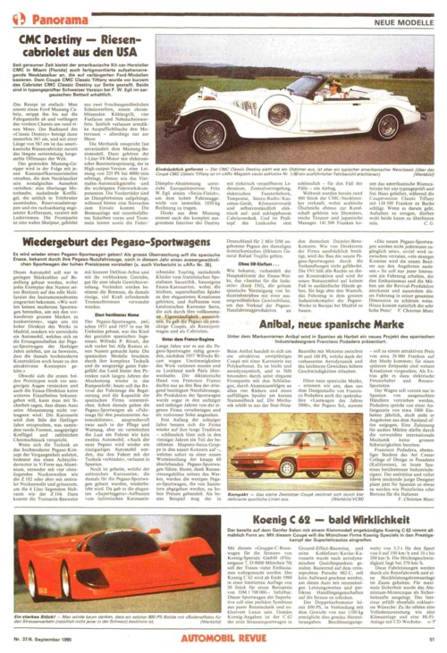 ... ab Herbst ein neues Projekt des spanischen Industriedesigners Francisco Podadera präsentiert. Kompakt — Das kleine Zweisitzer-Coupe zeichnet sich durch klar definierte sportliche Linien aus. (Werkbild/VCM) Der bereits auf dem Genfer Salon mit einem Kleinmodell angekündigte Koenig C 62 nimmt allmählich Form an: Mit diesem Coupe will die Münchner Firma Koenig-Specials in den Prestigekampf der Superlativautos eingreifen. Ein starkes Stück! — Man würde kaum denken, dass ein solcher 800-PS-Bolide mit «Bodeneffekt» für den Strassenverkehr (natürlich nicht jener in der Schweiz) bestimmt ist. (Werkbild) Das Rezept ist einfach: Man nimmt einen Ford Mustang Cabrio, strippt ihn bis auf die Fahrgastzelle ab und verlängert das vordere Chassis um rund einen Meter. Der Radstand des «Classic Destiny» beträgt dann immerhin 367 cm, und mit einer Länge von 567 cm ist das amerikanische Riesencabriolet zurzeit das längste serienmässig hergestellte Offenauto der Welt. Das gestreckte Mustang-Gerippe wird in der Folge mit jenen Kunststoffkarosserieteilen versehen, die dem Neoklassiker sein nostalgisches Aussehen verleihen: eine überlange Motorhaube, ausladende Kotflü- gel, die seitlich in Trittbretter ausmünden, Reserveradattrappen und ein rucksackartig angesetzter Kofferraum, verziert mit Lederriemen. Die Frontpartie ist eine wahre Skulptur, gebildet aus zwei ...