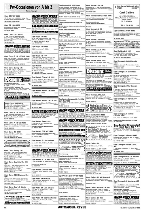 ... vorne, R/TB usw., nur Fr. 20 500.- 54S5335N Tel. 061 313 70 11 (Herr Mägli)Tel. 079 322 14 83 Opel Astra Caravan GLS1.8i 16V 2. 1995, 23 600 km, R/TB, Klima, el. Fenster,Alu-Räder, 8fach bereift, Sportsitze, Wegfahrsperre, Topzustand. 44S5140N Tel. 062 298 17 37 Opel Astra Caravan 1.6i Sportive, 30. 7 1993, Klima, R/TB, Galerie,Laderaumabdeckung, spectralblau, 70 000 km, Fr. 14 600.- 34T27216 Tel. 031 755 57 05 (bis 22 Uhr Opel Astra Caravan CD 1.6 1994 weiss, 45 000 km, 8fach bereift, Klima, Radio,Fr. 15 400.- 44 T 26104 Tel. 022 884 99 00 Opel Astra Caravan GL 1.6 16VSafe-Tec 1995 weiss, 35 000 km, 8fach bereift, Klima, Radio,Fr. 16 200.- 44S26004 Tel. 022 884 99 00 aumwmv westeine von. 1'wOO' occasdonen 94er OPEL ASTRA 1.41 GL CARAVAN, 36 729 km, casablancaweiss, R/TB, Sl, ZV, u’frei, nur 12’800.- Tel.01’738’40’50, Eintausch & Ankauf 24h BesichtigungauchSAMSTAG/SONNTAG automm westeine von. Iw# occasdonen 936r OPEL ASTRA 1.61 SPORTIVE AC, 59 364 km, novablack met, alle Service Klimae, Alu. R/TB, Sl, ZV, 5-türig, u’frei, nur 13’500- Tel.01 ’738'40’80, Eintausch & Ankauf24h Besichtigung auch SAMSTAG / SONNTAG I** Öl/flAO 04 OA Jh JL I+ + 01/862 24 24 + + Opel Astra GSi 2.0-16V 1993 5748rschwarz met., aus 1. Hand, 55 000 km, ABS, R/TB und CD- Wechsler, tiefergelegt, Remus, Spez.-Alu, Fr. 19 800.-> 1. 1 * ...