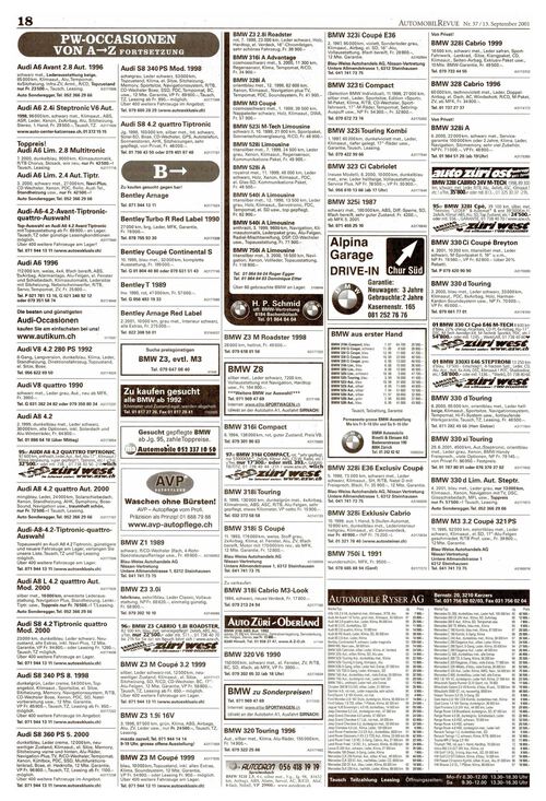 ... AGNissan-Vertretung A3166956 Untere Allmendstrasse 1, 6312 SteinhausenTel. 041 741 73 75 Zu verkaufen BMW 318i Cabrio M3-Look 1994, schwarz, neues verdeck, Fr. 17 800.-.Tel. 079 213 24 94 A3177180 ObERlAINldAuToZümBMW 318i ABS Aut. 1992 weiss, 25 200 km, Klimatronic, Zentralverriegelung, ServolenkungAlu-Felgen, Stereo, nur Fr. 13 800.-. 8340 Hinwil, Tel. 01 938 37 47, www. A-Z-O.ch 317758 s BMW 320 V6 1990 150000km, schwarz met., el. Fenster, ZV, R/TB,BC, SD, 4fach, ab MFK, VP Fr. 3800.-. Tel. 079 302 65 32 (ab 18 Uhr) A3174934 BMW Z3 M Roadster 1998 28000 km, hellrot, Fr. 49000.-.Tel. 079 618 01 58 B3177333 H. P. Schmidoff. BMW-Vertretung 8184 BachenbülachTel. 01 864 84 04 PW-OCCASIONEN VON A—Z FORTSETZUNG Audi A6 Avant 2.8 Aut. 1996 Audi S8 340 PS Mod. 1998 schwarz met., Lederausstattung beige,85000km, Klimaaut., Alu,Tempomat, 4xSitzheiung, Infra-ZV, Arml., R/CD, Topzustandnur Fr. 23500.-, Tausch, Leasing, A3177606 Auto Sonderegger, Tel. 052 366 29 66 achatgrau, Leder schwarz, 53000 km,Topzustand, Klima, el. Sitze, Sitzheizung, Memory, Sportsitze, Navigationssystem, R/TB,CD-Wechsler Bose, SSD, PDC,Tempomat, BC, usw,, 12 Mte. Garantie,VP Fr. 69800-,Tausch,TZ, Leasing ab Fr. 890 - möglich. A3177349 Über 400 weitere Fahrzeuge im Angebot. Audi A6 2.4i Steptronic V6 Aut. Tel. 079 600 28 29 (www.autoexklusiv.ch) 1998, 96000km, schwarz met., Klimaaut., ABS,ASR, ...