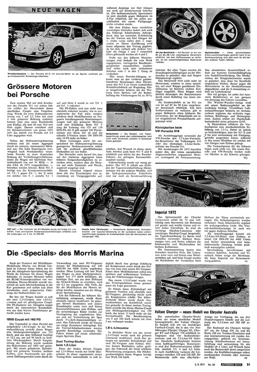 ... Den neuen Porsche-Jahrgang erkennt man an den vorderen gummibewehrten Stossstangen ohne Hörner, sowie den 911 S an einem zusätzlichen Windabtriebsblech am Wagenbug. Diese neugeformte Schürze mit der Wirkung eines Spoilers soll die Bodenhaftung des Vorderwagens bis zu 50 % Zum zweiten Mal seit dem Erscheinen des Porsche 911 vor sieben Jahren erfährt der Motorinhalt dieses sportlichen Coupes eine Vergrösserung. Wurde die erste Hubraumerweiterung von 2 auf 2,2 Liter mit einer 4 mm grösseren Bohrung realisiert, kommt jetzt eine neue Kurbelwelle zum Einbau, die statt 66 nun 70,4 mm Hub ergibt. Daraus errechnet sich ein Zylindervolumen von genau 2341 cm3, das jedoch von Porsche mit 2,4 Liter angegeben wird. Neben der Hubraumvergrösserung zeichnen sich die neuen Aggregate durch ein weiteres, interessantes Merkmal aus: Die hohe Exportquote (vorwiegend nach Nordamerika) veranlasste Porsche zu einer drastischen Senkung der Verdichtungsverhältnisse, damit die Wagen mit bleifreiem Normaltreibstoff von nur 91 ROZ — in den USA ab 1972 vorgeschrieben — betrieben werden können. Beim 911 T beträgt nun das Kompressionsverhältnis 7,5 : 1 gegen 8,6 1; der E weist ein solches von 8 . 1 anstelle 9,1 1 auf und beim S wurde es von 9,8 1 auf 8,5 . 1 reduziert. Die PS-Zahlen sind nun nicht etwa ebenfalls reduziert worden, wie es normalerweise der Fall wäre, ...