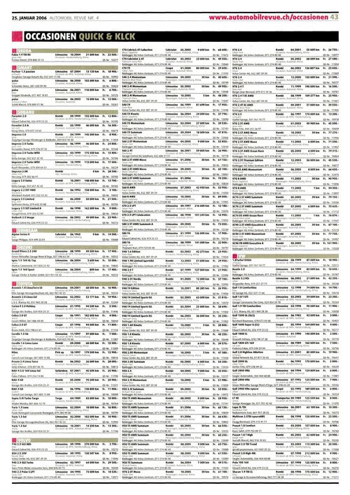 ... 2.0 Kombi 04.1999 145 000 km Fr. 8 900.- grau Occasion ab MFK, AutomatZiegelgut Garage Ellenberger & Bütikofer, 034 423 10 30 QS-Nr: 11404 Limousine 06.1999 46 000 kmFr. 24 800.-Impreza 2.0 Turbo Occasion, Handschaltung, Klimagrau met Fernandes Raoul, 079 376 07 76 QS-Nr: 10168Limousine 03.1999 175 500 kmFr. 15 800.-Impreza 2.0 Turbo WRX Occasion ab MFK, Handschaltung, KlimablauDelta Garage, 052 657 42 42 QS-Nr: 10106 Limousine 10.1999 113 000 kmFr. 17 500.-Impreza 2.0 Turbo WRXdunkelblau met Ruoff Alexander, 079 304 64 31Occasion, HandschaltungQS-Nr: 102290 kmFr. 28 500.-KombiImpreza 2.0R Silber metIten Jürg, 079 302 66 91neu, Automat, Klima QS-Nr: 10785 Kombi 10.2001 148 000 kmFr. 13 700.-Legacy 2.0 SwissSilber Delta Garage, 052 657 42 42Occasion ab MFK, Handschaltung, KlimaQS-Nr: 10105Kombi 06.1992 158 000 kmFr. 3100.-Legacy 2.2 SST 4W0 bordeauxAllenbach Rudolf, 031 332 53 33Occasion, Handschaltung, KlimaQS-Nr: 10692 Fr. 21 500.-Kombi 06.2000 50 000 kmLegacy 2.5 Limitedblau met Spillmann Heinz, 079 642 55 88Occasion, Automat, KlimaQS-Nr: 10705Legacy 2.5 SST Limited AKombi 06.1998 162 000 kmFr. 9 000.- Occasion, Automat, KlimaSilber metVoegeli Ernst, 079 354 52 89 QS-Nr: 10654 Limousine 06.2002 49 000 kmOutback 2.5 Image Fr. 23 900.-Occasion ab MFK, Handschaltunggrün Eduard Zahnd AG, 026 419 23 23 QS-Nr: 10213 Okm Fr. 14 500.-Cabrio et 06.1965Alpine Series Vblau ...