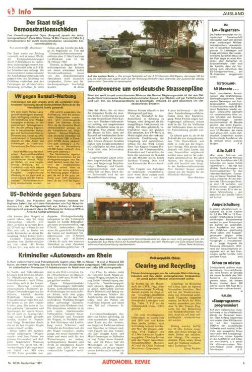 ... werden im Zuge eines «Clearing»-Geschäftes noch einmal 1600 tschechoslowakische Lastwagen vom Typ Tatra T 815 in die Volksrepublik China (VRC) geliefert. Die zwei davorliegenden Lieferungen im letzten Jahr und 1988 sind von keiner Seite weder zahlennoch wertmässig benannt worden. Der Wert der jetzigen Lieferung wird dagegen mit 85,5 Mio Schweizer Franken angegeben. Clearing-Partner sind das Prager Aussenhandelsunternehmen Motokov AG und die China National Maschinery Corporation. «Clearing» im Recycling will China auch im eigenen Strassenbau betreiben. Hier soll bei der Wiederverwendung von Altmaterial anfallende Flugasche eingesetzt werden. Im Reich der Mitte werden ausserdem pro Jahr etwa 70 Mio Tonnen Flugasche bei der Befeuerung von Kohlekraftwerken imitiert. Auch sie soll jetzt vollumfänglich wiederverwendet werden Bislang wurden hierfür nur 20 Mio Tonnen eingesetzt, also etwas weniger als einen Drittel der anfallenden Menge. Die entsprechenden Pläne sehen dabei auch die Nutzung ausländischer Techniken vor Georg Wadehn Krimineller «Autowasch» am Rhein In Rom verschwinden laut Polizeistatistik täglich etwa 100, in Neapel 110 und in Mailand 120 Autos, die meist den Weg über die Schweiz nach Deutschland einschlagen. 1990 wurden allein im südbadischen Grenzraum 14 Nobelkarossen im Marktwert von 1 Mio DM sichergestellt. In Nachtund ...