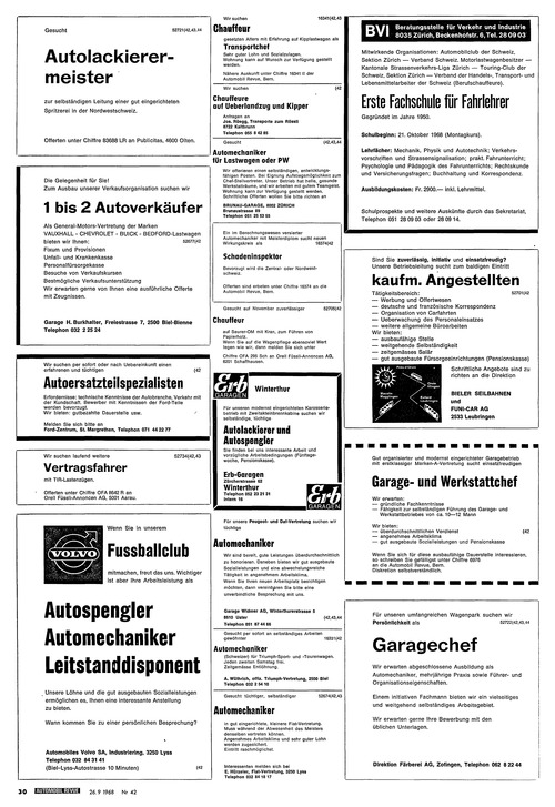 ... Besprechung? Automobiles Volvo SA, Industriering, 3250 Lyss Telephon 032 84 31 41 Sehr guter Lohn und Sozialzulagen. Wohnung kann auf Wunsch zur Verfügung gestellt werden. Nähere Auskunft unter Chiffre 16341 II der Automobil Revue, Bern. Chauffeure auf Ueberlandzug und Kipper Automechaniker für Lastwagen oder PW Wir offerieren einen selbständigen, entwicklungsfähigen Posten. Bei Eignung Aufstiegsmöglichkeit zum Chef-Stellvertreter. Unser Betrieb hat helle, gesunde Werkstatträume, und wir arbeiten mit gutem Teamgeist. Wohnung kann zur Verfügung gestellt werden. Schriftliche Offerten wollen Sie bitte richten an BRUNAU-GARAGE, 8002 ZÜRICH Brunaustrasse 89 Telephon 051 25 53 55 Ein im Berechnungswesen versierter Automechaniker mit Meisterdiplom sucht neuen Wirkungskreis als 16374(42 Bevorzugt wird die Zentraloder Nordwestschweiz. Offerten sind erbeten unter Chiffre 16374 an die Automobil Revue, Bern. Mitwirkende Organisationen: Automobilclub der Schweiz, Sektion Zürich — Verband Schweiz. Motorlastwagenbesitzer — Kantonale Strassenverkehrs-Liga Zürich — Touring-Club der Schweiz, Sektion Zürich — Verband der Handels-, Transportund Lebensmittelarbeiter der Schweiz (Berufschauffeure). Schulbeginn: 21. Oktober 1968 (Montagkurs). Lehrfächer: Mechanik, Physik und Autotechnik; Verkehrsvorschriften und Strassensignalisation; prakt. Fahrunterricht; Psychologie und Pädagogik ...