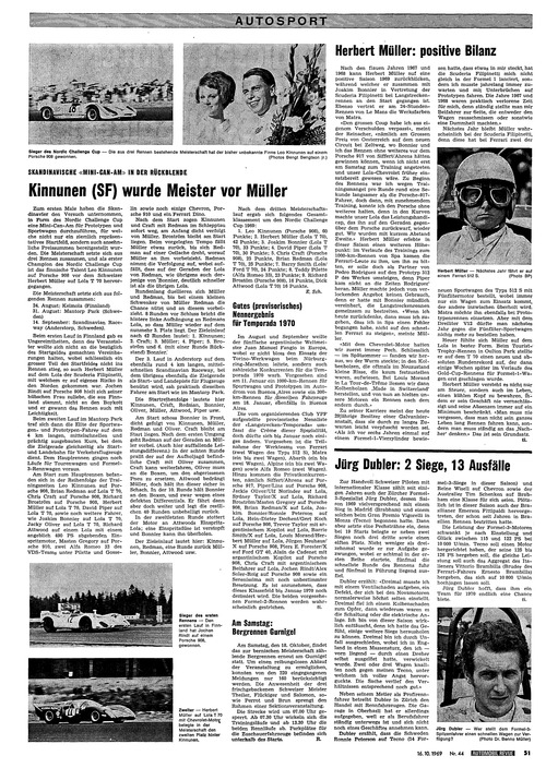 ... des Startgeldes gemachten Vereinbarungen halten, wobei schliesslich ein grosser Teil des Startfeldes nicht ins Rennen stieg, so auch Herbert Müller auf dem Lola der Scuderia Filipinetti, mit welchem er auf eigenes Risiko in den Norden gekommen war. Jochen Rindt auf Porsche 908 hielt sich seiner hübschen Frau zuliebe, die aus Finnland stammt, nicht an den Boykott und er gewann das Rennen auch mit Leichtigkeit. Beim zweiten Lauf im Mantorp Park traf sich dann die Elite der Sportwagenund Prototypen-Fahrer auf dem 4 km langen, mittelschnellen und prächtig ausgebauten Kurs, bei dem die Zielgerade gleichzeitig als Startund Landebahn für Verkehrsflugzeuge dient. Dem Hauptrennen gingen noch Läufe für Tourenwagen und Formel- 3-Rennwagen voraus. Am Start zum Hauptrennen befanden sich in der Reihenfolge der Trainingszeiten Leo Kinnunen auf Porsche 908, Brian Redman auf Lola T 70, Chris Craft auf Porsche 908, Richard Broström auf Porsche 908, Herbert Müller auf Lola T 70, David Piper auf Lola T 70, sowie noch weitere Fahrer, wie Joakim Bonnier auf Lola T 70, Jacky Oliver auf Lola T 70, Richard Attwood auf einem Lola mit einem angeblich 490 PS abgebenden Einspritzmotor, Masten Gregory auf Porsche 910, zwei Alfa Romeo 33 des VDS-Teams unter Pilette und Gossehn sowie noch einige Chevron, Porsche 910 und ein Ferrari Dino. Nach dem Start zogen Kinnunen und Craft mit ...