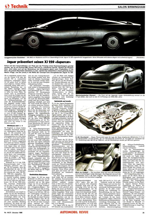 ... überzogen. Die Sitzgurten wie auch die Verstelltasten sind in die Sitze integriert. Das Instrumentarium ist eher klassisch als futuristisch ausgelegt. Ob es tatsächlich einmal einen wie der Ferrari F 40 oder der Porsche 959 in «numerierter Kleinserie» aufgelegten Jaguar XJ 220 geben wird, ist derzeit noch ungewiss. Gemäss Werksmitteilung würde selbst eine limitierte Herstellung erst «in den frühen neunziger Jahren möglich» sein. Die Firma Jaguar selbst hat keine Pläne, ein solches Auto zu produzieren, doch werde das Projekt nun der vor kurzem gegründeten Jaguar Sport Ltd übergeben, von der die Publikumsreaktionen wie auch die Kommerzialisierbarkeit abgeklärt werden sollen. Inoffiziell verlautet jedoch, dass bereits eine grössere Anzahl Bestellungen vorliege und dass an einen möglichen Verkaufspreis von 250 000 Pfund Sterling, also rund 675 000 Franken, gedacht werde. Damit würden die offiziellen Verkaufspreise (noch nicht aber die heute verlangten Spekulationssummen) von F 40 und «959» bei weitem in den Schatten gestellt. Im Vergleich zu diesen beiden zumindest theoretisch anvisierten «Serienautos» bietet der Jaguar XJ 220 wesentlich mehr Zylinder und Ventile, denn erwartungsgemäss ist er mit einem V-12-Motor mit je zwei obenliegenden Nockenwellen und insgesamt 48 Ventilen ausgerüstet (wie sonst nur Ferrari Testarossa und Lamborghini Countach). Und ...