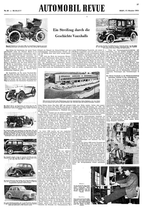 ... mit GM von 1930 an gebaut und zu einem Preis von unter 300 Pfund (7500 Fr.) verkauft. Mit einem Verbrauch «von weniger als 7 Liter» pro 100 km erwies sich der Vauxhall «10» aus dem Jahre 1937 als im Betrieb ausgesprochen sparsamer Familienwagen. Das erste Nachkriegsmodell, das in zwei Versionen, mit einem4- oder einem 6-Zylinder-Motor, geliefert und in der Schweiz durch die GM Suisse in Siel montiert wurde. körpert ein Beispiel der Beharrlichkeit und der Anstrengungen unternehmerischen Geistes, denen der Erfolg denn auch nicht versagt geblieben ist. 1957 wird das Werk die hundertste Wiederkehr seines Geburtstages feiern können, ins Leben getreten aber ist es als kleine, von einem schottischen Ingenieur namens Wilson für den Bau von Schiffsmotoren gegründete Fabrik. Seine Wirkungsstätte hatte es in der Giesserei der Vauxhall Iron Works.auf geschlagen. Binnen kurzer Zeit wuchs das Unternehmen zu ansehnerstes Militärflugzeug Vauxhalls, mit einem 25 PS-Motor ausgerüstet, wird von 1914 an in namhaften Quantitäten an die verschiedenen Kriegsfronten geliefert. Unmittelbar nach dem Krieg tritt die Fabrik an die Organisation der Serienfertigung heran, die 1923 bereits 1300 Stück erreicht. Gleichzeitig widmete sie sich auch weiterhin dem Bau sportlicher Wagen. In ihrem Auftrag entwickelte Harry Ricardo, der heute weltberühmte Konstrukteur, einen Dreilitermotor ...