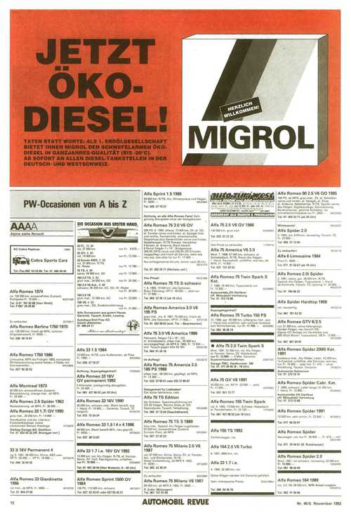 ... km, rot, Alu-Felgen,el. Fenster, Servo, ZV, Holzlenkrad, nur Fr. 13 900. —, 4 Mte. GarantieSupereintauschofferten. Garage TMC, Hardturmstr. 180Tel. 01 271 30 60 (9-19 Uhr) 33S5723C Alfa 75 QV V6 1991 34 000 km, rot, NP Fr. 33 500, — , jetztFr. 17 900 —. 43T5930C Tel. 031 921 72 77 Alfa Romeo 155 Twin Spark rot, 4, 1992, 13 500 km, Schiebe-/Hebedach,el. Fensterheber, Fr. 24 100.—. 13T3434C Tel. 061 421 96 52 (ab 19 Uhr) Alfa 155 TS 1992 Vorführwagen, rot. Alfa 164 2.0 V6 Turbo 9. 1991,9600 km, rot. Alfa 33 1.7 i.e 4.1990, 25 300 km, rot. Diese Wagen werden mit Garantie geliefert. Sehr interessante Preise. 33S4l266kv Tel. 066 58 46 76 PW-0ccasionen von A bis Z AAAA DIE OCCASION AUS ERSTER HAND. Alpine siehe Renault 33 FL, 10 89rot, 37 600 km nur Fr. 9 870 — 33 QV, 5. 90rot, 14 600 km nur Fr. 12 250.— 33 Kombi 4WD, 2. 89rot, 37 900 km, R/TB, W.-Räder nur Fr. 12 780.— 75 TS, 6. 88weiss, 54 800 km, SD nur Fr. 13 950.— 164 2,0 TS, 4. 92grün met., 24 500 km, SD nur Fr. 26 350. — 164 3.0 V6 Aut., 6. 89schwarz, 46 200 km, AC, SD, W.-Räder nur Fr. 26 900 — 164 3.0 V6grün met., 72 300 km, AC nur Fr. 23 650.— 155 V6, 4. 92grau met., SD, Direktionsfahrzeug nur Fr. 31 860,— Alfa Romeo 1974 ca. 100 000 km, einwandfreier ZustandRichtpreis Fr. 16 500. —. 40S31939 Tel. G 01 761 82 88 (Herr Welti)Tel. P 057 34 28 80 Alfa-Occasionen aus gutem Hause. Garantie, Tausch, Kredit, Leasing. ...