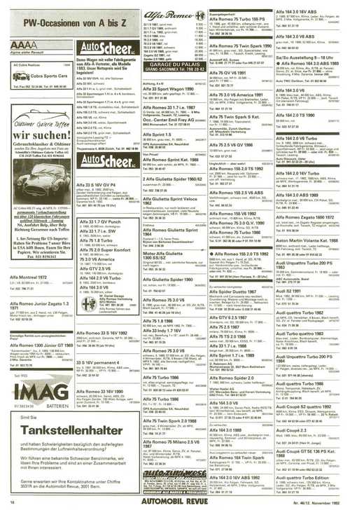... 82 55 28 Einmalige Rarität zum unvergleichlichenPreis! Alfa Romeo 1300 Jünior GT 1969 "Kantenhauber", Inv. 2. 1969, 138 800 km,Wagen wurde 1990 für Fr. 6000.— restauriert, Preis frisch ab MFK nur Fr. 7800 —, inkl3 Mte. Garantie. 40S6675C Tel. 01 923 73 70 Alfa 33 S 16V QV P4 Silber met., 8. 1992, 3500 km,Zender-Verbreiterung und Felgen, aus gesundheitlichen Gründen zu verkaufen,Commerz. NP Fr. 33 140 —, netto Fr. 26 800. — . Garantie bis 8. 1993 . 36S32195 Tel. 061 851 40 79 (ab 19 Uhr) Oldtimer (jaterie Toffen wir suchen! Gebrauchsklassiker & Oldtimersenden Sie Ihre Angebote mit Foto an: Schmidlin's Oldtimer Galerie Toffen AGCH-3125 Toffen Tel. 031 8196161 AC Cobra MKIV orig, ab MFK Fr. 135'000.~ vermanente Verkaufsausstellung mit über 120 klassischen Fahrzeugen eeöffnet Mittwoch -Sonntag N6, Ausfahrt Belp, über Belp Richtung Gerzensee nach Toffen 1. Inv. Setzung für US-Importe: Haben Sie Probleme ? unser Büro in USA hilft Ihnen. Faxen Sie Ihre Papiere. Wir orientieren Sie. Fax 031 8196161 5 500,-33 1.5 1987, sand met. 9 300.- 33 1.7 QV 1989, anthrazit 17 900 — 33 1.7 i.e. 1992, grün met.75 2.0 1988, blau 11 900. - 18 300.-75 2.0 1990, rot 9 900.- 75 2.5 V61987, rot 12 900 -75 2.5 V6 1987, schwarz 25 900 -164 3.0 V6 1989, grün met 89 000 - Zagato SZ 1991, rotSpider 2.0 1992, gelb 32 500.- GARAGE DU PALAIS GRAND-SACONNEX ...