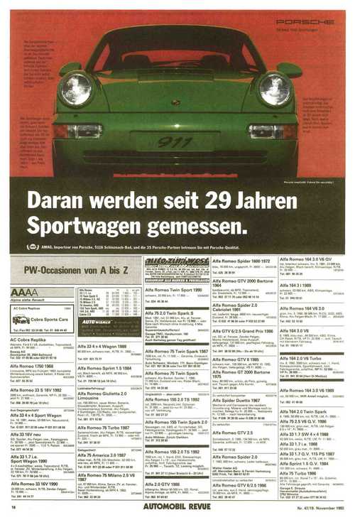 ... Replika Weinem, Ford 5 I V8, dunkelblau, Topzustandab MFK, Fr. 84 000.-. * 33T6635C Bewag AGStockacker 29, 2564 Bellmund Tel. 032 41 55 66 oder 032 51 93 18 Alfa Romeo 1750 1968 Limousine, MFK bis Frühjahr 1993, kompletteWinterausrüstung sowie Ketten, 4 Räder mit Sommerreifen. 40S32805Tel. 027 55 35 52 Alfa Romeo 33 S 16V 1992 2000 km, anthrazit, Garantie, NP Fr. 25 350. — ,jetzt Fr. 21 500 —. 34S32997 Tel. 056 26 80 79 (ab 19 Uhr) Aus Gegengeschäft! 38T33346 Alfa 33 4 x 4 Sport WagonInv. 10. 1991, weiss, 33 000 km, Neuzustand Fr. 14 400.- Tel. G 031 911 22 05 oder P 031 911 08 88 Alfa 33 16V neu SD, Spoiler, Alu-Felgen usw., KatalogpreisFr. 26 000. —, jetzt Spezialpreis Fr. 22 900. — , sie sparen Fr. 3300. — , 12,6 % Rabatt. 40S34058Tel. 077 44 34 35 Alfa 331.7 i.e Sport Wagon 19904x4 zuschaltbar, weiss, Topzustand, R/TB, ei. Fenster, ZV, Winterbereifung, 4 Alu-Felgen,22 100 km, Fr. 10 500.-. 26S34605 Tel. 071 7811 56 (ab 18 Uhr) Alfa Romeo 33 16V 1990 20 000 km, schwarz, R/TB, Zender-Felgen,Fr. 15000.—. 53S41472kv Tel. 041 44 14 77 88er ALFA ROMEO 75 3.0 VB, 58 806 km, rot, Kat. Alu. el. Fenster, Servo, ZV, »frei, nur 11 900.-Fr. Otter 279.-Fr. ohne Am. SUPER EINTAUSCHOFFERTEN Tel. R.GUnthart 01/730 12 2024h freie Besichtigung, auch SAMSTAG/SONNTAG BARANKAUF AUF MARKEN & PREISKLASSEN Alfa Romeo Twin Sport 1990 schwarz, 33 000km, Fr. 17 800. — . 53S6029C Tel. 034 45 ...