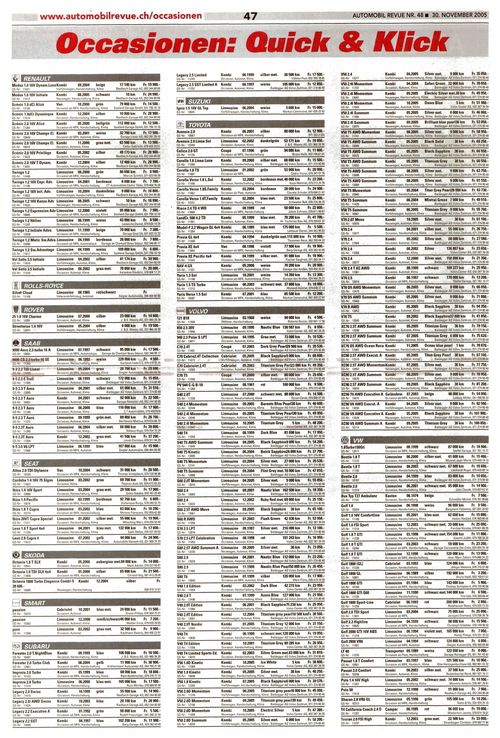... 11741 Vorführwagen, Handschaltung, Klima Baldegger AG Volvo Zentrum, 071 274 80 40 Kombi 05.2005 Black Solid 30 km Fr. 60 250.-Neuwagen, Handschaltung, Klima Baldegger AG Volvo Zentrum, 071 274 80 40V50 T5 AWD SummumQS-Nr: 13049 Black Sapphire 30 km Fr. 66 550.-Baldegger AG Volvo Zentrum, 071 274 80 40Kombi 05.2005Neuwagen, Automat, KlimaV50 T5 AWD SummumQS-Nr: 10525 Titanium Grey 30 km Fr. 66 550.-Baldegger AG Volvo Zentrum, 071 274 80 40Kombi 05.2005Neuwagen, Automat, KlimaV50 T5 AWD SummumQS-Nr: 12032 Kombi 08.2005 Silver met. 9 000 km Fr. 63 750.-Vorführwagen, Handschaltung, Klima Baldegger AG Volvo Zentrum, 071 274 80 40V50 T5 AWD SummumQS-Nr: 13088 Kombi 08.2005 Silver met. 9 000 km Fr. 61 550.-Vorführwagen, Handschaltung, Klima Baldegger AG Volvo Zentrum, 071 274 80 40 Kombi 05.2004 Titan Grey Pearl28 000 km Fr. 43 730.-Occasion, Handschaltung, Klima Baldegger AG Volvo Zentrum, 071 274 80 40 V50 T5 AWD SummumQS-Nr: 13089 V50 T5 MomentumQS-Nr: 10940 Mistral Green 7 000 km Fr. 49 510.-Baldegger AG Volvo Zentrum, 071 274 80 40Kombi 06.2004Occasion, Automat, KlimaV50 T5 SummumQS-Nr: 11425 Kombi 06.2005 Titanium Grey 9000 km Fr. 55 760.-Vorführwagen, Automat, Klima_Baldegger AG Volvo Zentrum, 071 274 80 40V50 T5 SummumQS-Nr: 10961 Silver met. 30 km Fr. 61100.-Baldegger AG Volvo Zentrum, 071 274 80 40Kombi 10.2005Neuwagen, Automat, KlimaV70 2.0T MoveQS-Nr: 10976 Kombi ...